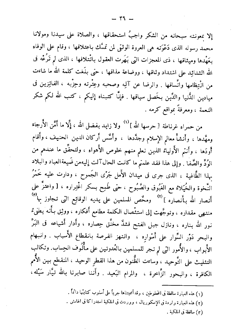 من حَمْرَاء غرناطة [حرسها الله] وَلَا زايد بِفضل الله، إِلَّا مَا أَمن الأرجاء ومهدها، وَأَنْشَأَ معالم الْإِسْلَام وجددها، وَأسسَ أَرْكَان الدّين الحنيف، وَأقَام أودها، وَأَنْتُم الْأَوْلِيَاء الَّذين نعلم مِنْهُم خلوص الْأَهْوَاء، ولتحقق مَا عِنْدهم من الود والصفا. وَإِلَى هَذَا فقد علمْتُم مَا كَانَت الْحَال آلت إِلَيْهِ من ضَيْعَة الْعباد والبلاد بِهَذَا الطاغية، الَّذِي جرى فِي ميدان الأمل جرى الجموح، ودارت عَلَيْهِ خمر النخوة وَالْخُيَلَاء مَعَ الغبوق والصبوح، حَتَّى طمح بسكر اغتراره، [واعتز على أنصار الله بأنصاره] ومحص الْمُسلمين على يَدَيْهِ الوقائع الَّتِي تجَاوز بهَا مُنْتَهى مِقْدَاره، وتوجهت إِلَى استئصال الْكَلِمَة مطامع أفكاره، ووثق بِأَنَّهُ يطفىء نور الله بناره، ونازل جبل الْفَتْح فَشد مخنق حصاره، وأدار أشياعه فِي الْبر وَالْبَحْر دور السوار على أسواره، وانتهز الفرصة بِانْقِطَاع الْأَسْبَاب. وانبهام الْأَبْوَاب، والأمور الَّتِي لم تجر للْمُسلمين بالعدوتين على مألوف الْحساب. وتكالب التَّثْلِيث على التَّوْحِيد، وَسَاءَتْ الظنون من هَذَا الْقطر الوحيد، الْمُنْقَطع بَين الْأُمَم الْكَافِرَة، والبحور الزاخرة، والمرام الْبعيد. وأننا صابرنا بِاللَّه تيار سيله،