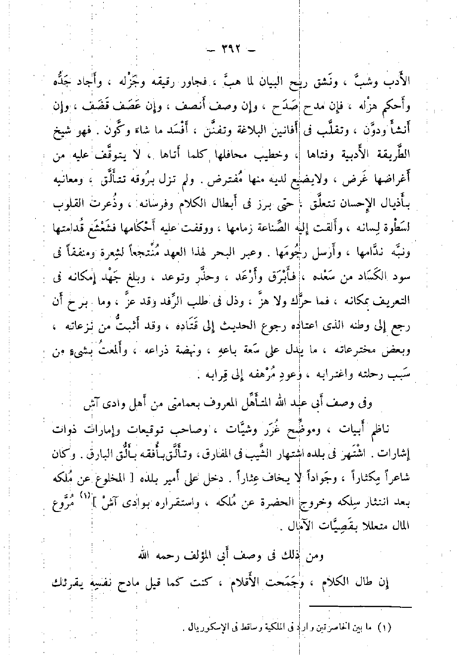 الْأَدَب وشب، ونشق ريح الْبَيَان لما هَب، فجاور رَقِيقه وجزله، وأجاد جده وَأحكم هزله، فَإِن مدح صدح، وَإِن وصف أنصف، وَإِن عصف قصف، وَإِن أنشأ وَدون، وتقلب فِي أفانين البلاغة وتفنن، أفسد مَا شَاءَ وَكَون، فَهُوَ شيخ الطَّرِيقَة الأدبية وفتاها، وخطيب محافلها كلما أَتَاهَا، لَا يتَوَقَّف عَلَيْهِ من أغراضها غَرَض، وَلَا يضيع لَدَيْهِ مِنْهَا مفترض، وَلم تزل بروقه تتألق، ومعانيه بأذيال الْإِحْسَان تتَعَلَّق، حَتَّى برز فِي أبطال الْكَلَام وفرسانه، وذعرت الْقُلُوب لسطوة لِسَانه، وَأَلْقَتْ إِلَيْهِ الصِّنَاعَة زمامها، ووقفت عَلَيْهِ أَحْكَامهَا فشعشع قدامتها وَنبهَ ندامها، وَأرْسل رجومها. وَعبر الْبَحْر لهَذَا الْعَهْد منتجعا لشعرة ومنفقا فِي سود الكساد من سعده، فأبرق وأرعد، وحذر وتوعد، وَبلغ جهد إِمْكَانه فِي التَّعْرِيف بمكانه، فَمَا حرك وَلَا هز، وذل فِي طلب الرفد وَقد عز، وَمَا برح أَن رَجَعَ إِلَى وَطنه الَّذِي اعتاده رُجُوع الحَدِيث إِلَى قتاده، وَقد أثبت من نزعاته، وَبَعض مخترعاته، مَا يدل على سَعَة بَاعه، ونهضة ذراعه، وألمعت بِشَيْء من سَبَب رحلته واغترابه، وعود مرهفه إِلَى قرَابه.