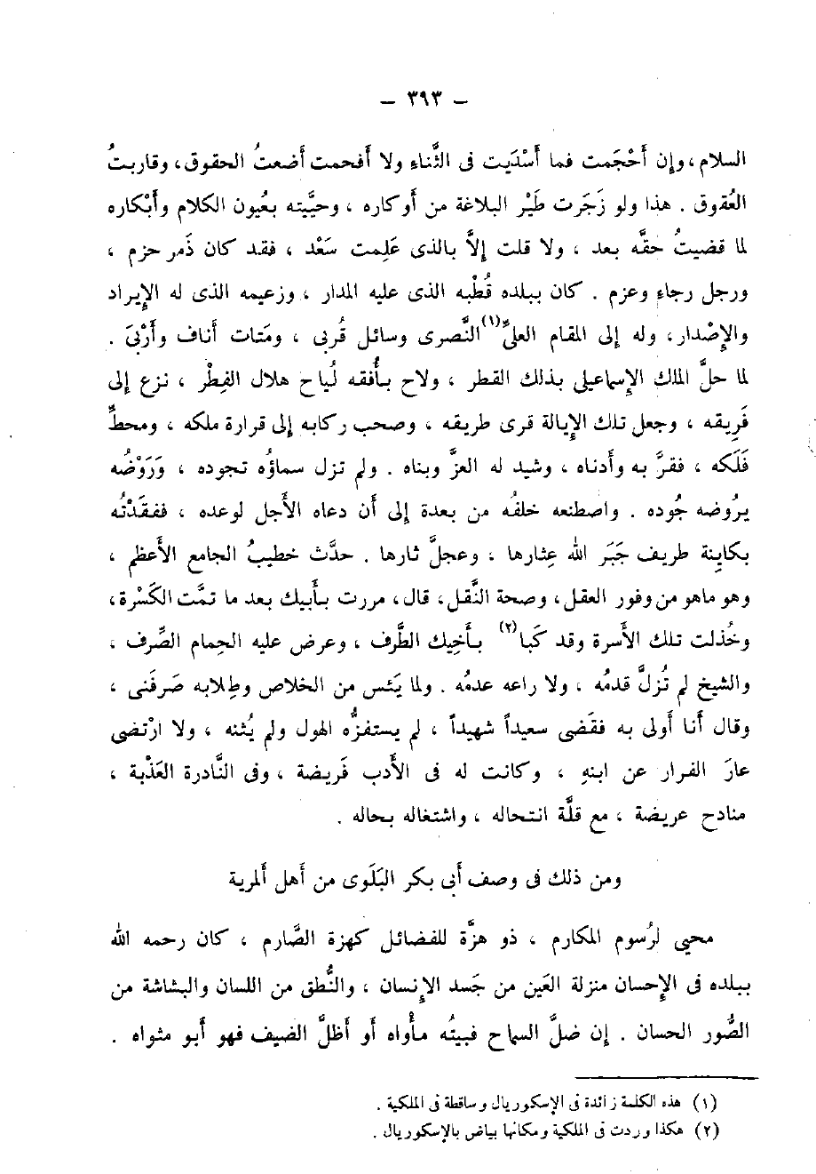 السَّلَام، وَإِن أحجمت فَمَا أسديت فِي الثَّنَاء وَلَا أفحمت أضعت الْحُقُوق، وقاربت العقوق. هَذَا وَلَو زجرت طير البلاغة من أوكاره، وحييته بعيون الْكَلَام وأبكاره لما قضيت حَقه بعد، وَلَا قلت إِلَّا بِالَّذِي علمت سعد، فقد كَانَ ذمر حزم، وَرجل رَجَاء وعزم، كَانَ بِبَلَدِهِ قطبه الَّذِي عَلَيْهِ الْمدَار، وزعيمه الَّذِي لَهُ الْإِيرَاد والإصدار، وَله إِلَى الْمقَام الْعلي النصري وَسَائِل قربى، ومتات أناف وأربى. لما حل الْملك الْإِسْمَاعِيلِيّ بذلك الْقطر، ولاح بأفقه لياح هِلَال الْفطر، نزع إِلَى فريقه، وَجعل تِلْكَ الإيالة قرى طَرِيقه، وَصَحب ركابه إِلَى قرارة ملكه، ومحط فلكه، فقر بِهِ وَأَدْنَاهُ، وشيد لَهُ الْعِزّ وبناه. وَلم تزل سماؤه تجوده، وروضه يروضه جوده. واصطنعه خَلفه من بعدة إِلَى أَن دَعَاهُ الْأَجَل لوعده، فَفَقَدته بكاينة طريف جبر الله عثارها، وَعجل ثارها، حدث خطيب الْجَامِع الْأَعْظَم، وَهُوَ مَا هُوَ من وفور الْعقل، وَصِحَّة النَّقْل، قَالَ، مَرَرْت بأبيك بعد مَا تمت الكسرة وخذلت تِلْكَ الأسرة وَقد كبا بأخيك الطّرف، وَعرض عَلَيْهِ الْحمام الصّرْف، وَالشَّيْخ لم تزل قدمه، وَلَا راعه عَدمه، وَلما يئس من الْخَلَاص وطلابه صرفني، وَقَالَ أَنا أولى بِهِ فَقضى سعيدا شَهِيدا، لم يستفزه الهول وَلم يثنه، وَلَا ارتضى عَار الْفِرَار عَن ابْنه، وَكَانَت لَهُ فِي الْأَدَب فَرِيضَة، وَفِي النادرة العذبة، منادح عريضة، مَعَ قلَّة انتحاله، واشتغاله بِحَالهِ،