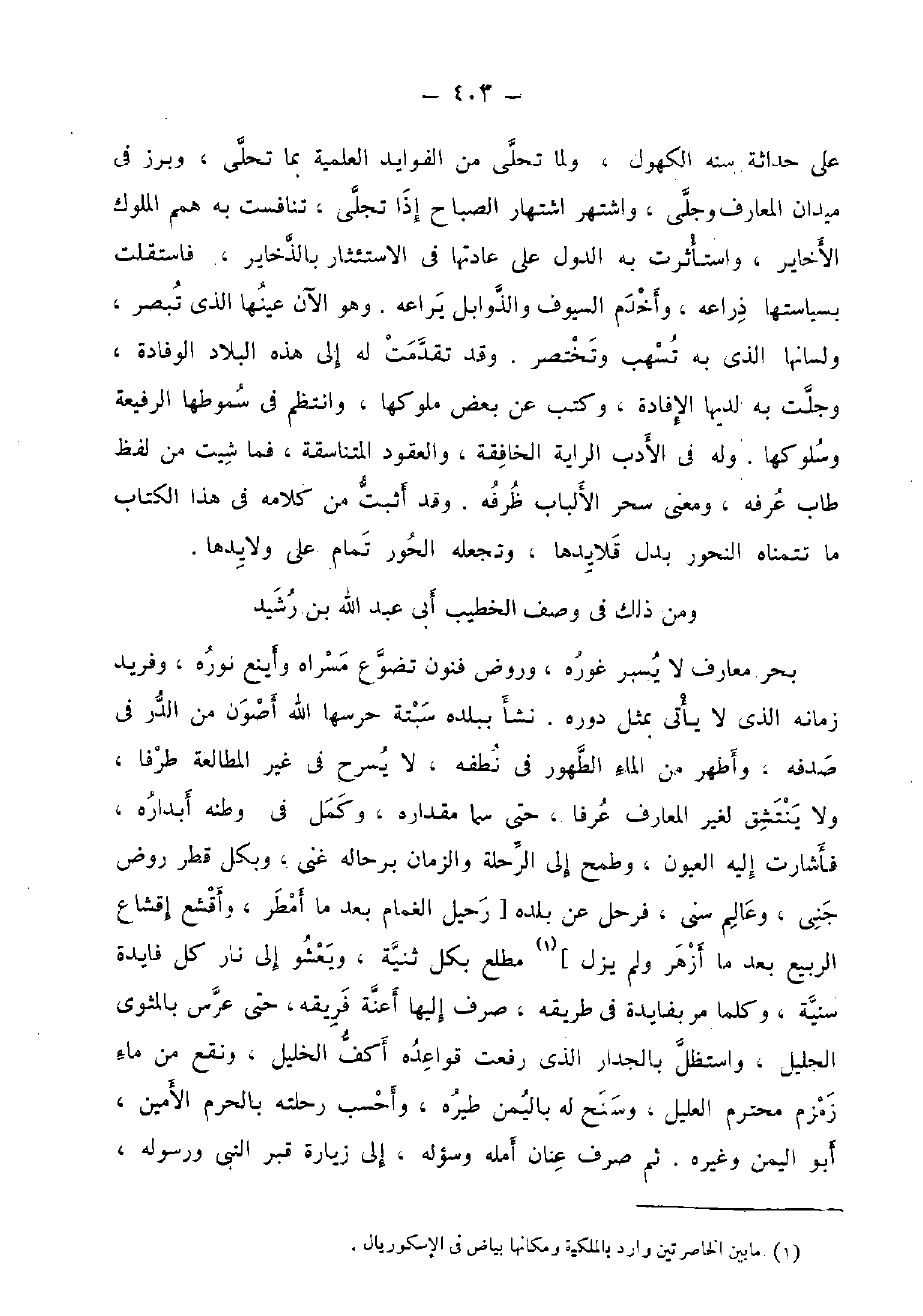 على حَدَاثَة سنه الكهول، وَلما تحلى من الفوايد العلمية بِمَا تحلى، وبرز فِي ميدان المعارف وجلى، واشتهر اشتهار الصَّباح إِذا تجلى، تنافست بِهِ همم الْمُلُوك الأخاير، واستأثرت بِهِ الدول على عَادَتهَا فِي الاستئثار بالذخاير، فاستقلت بسياستها ذراعه، وَأَخْدَم السيوف والذوابل يراعه. وَهُوَ الْآن عينهَا الَّذِي تبصر، ولسانها الَّذِي بِهِ تسهب وتختصر. وَقد تقدّمت لَهُ إِلَى هَذِه الْبِلَاد الْوِفَادَة، وجلت بِهِ لَدَيْهَا الإفادة، وَكتب عَن بعض مُلُوكهَا، وانتظم فِي سموطها الرفيعة وسلوكها. وَله فِي الْأَدَب الرَّايَة الخافقة، والعقود المتناسقة، فَمَا شيت من لفظ طَابَ عرفه، وَمعنى سحر الْأَلْبَاب ظرفه. وَقد أثبت من كَلَامه فِي هَذَا الْكتاب مَا تتمناه النحور بدل قلايدها، وتجعله الْحور تَمام على ولايدها.