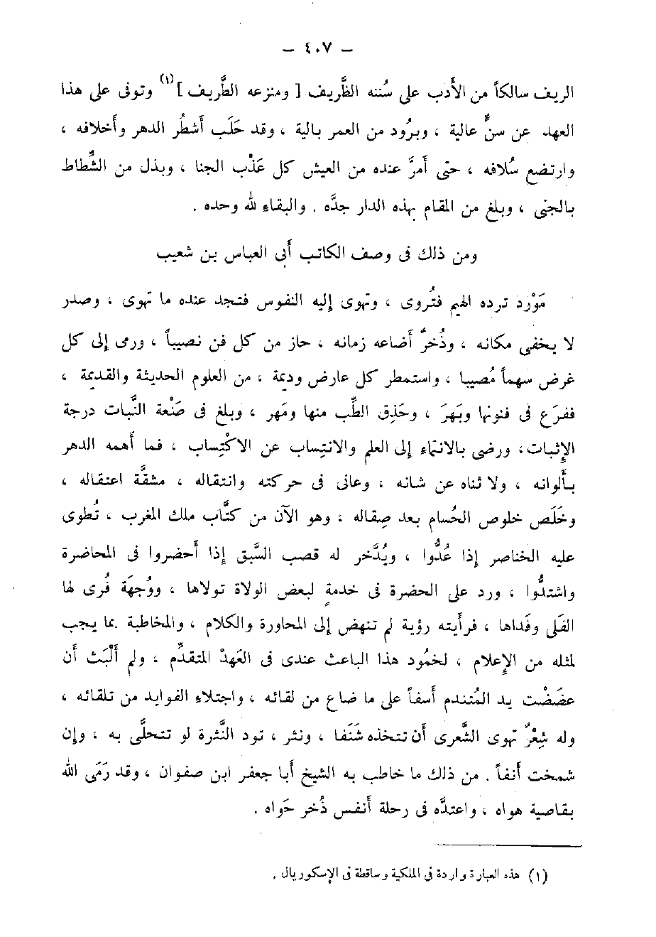 الرِّيف سالكا من الْأَدَب على سنَنه الظريف [ومنزعه الطريف] وَتُوفِّي على هَذَا الْعَهْد عَن سنّ عالية، وبرود من الْعُمر بالية، وَقد حلب أشطر الدَّهْر وأخلافه، وارتضع سلافه، حَتَّى أَمر عِنْده من الْعَيْش كل عذب الجنا، وبذل من الشطاط بالجنى، وَبلغ من الْمقَام بِهَذِهِ الدَّار جده. والبقاء لله وَحده.