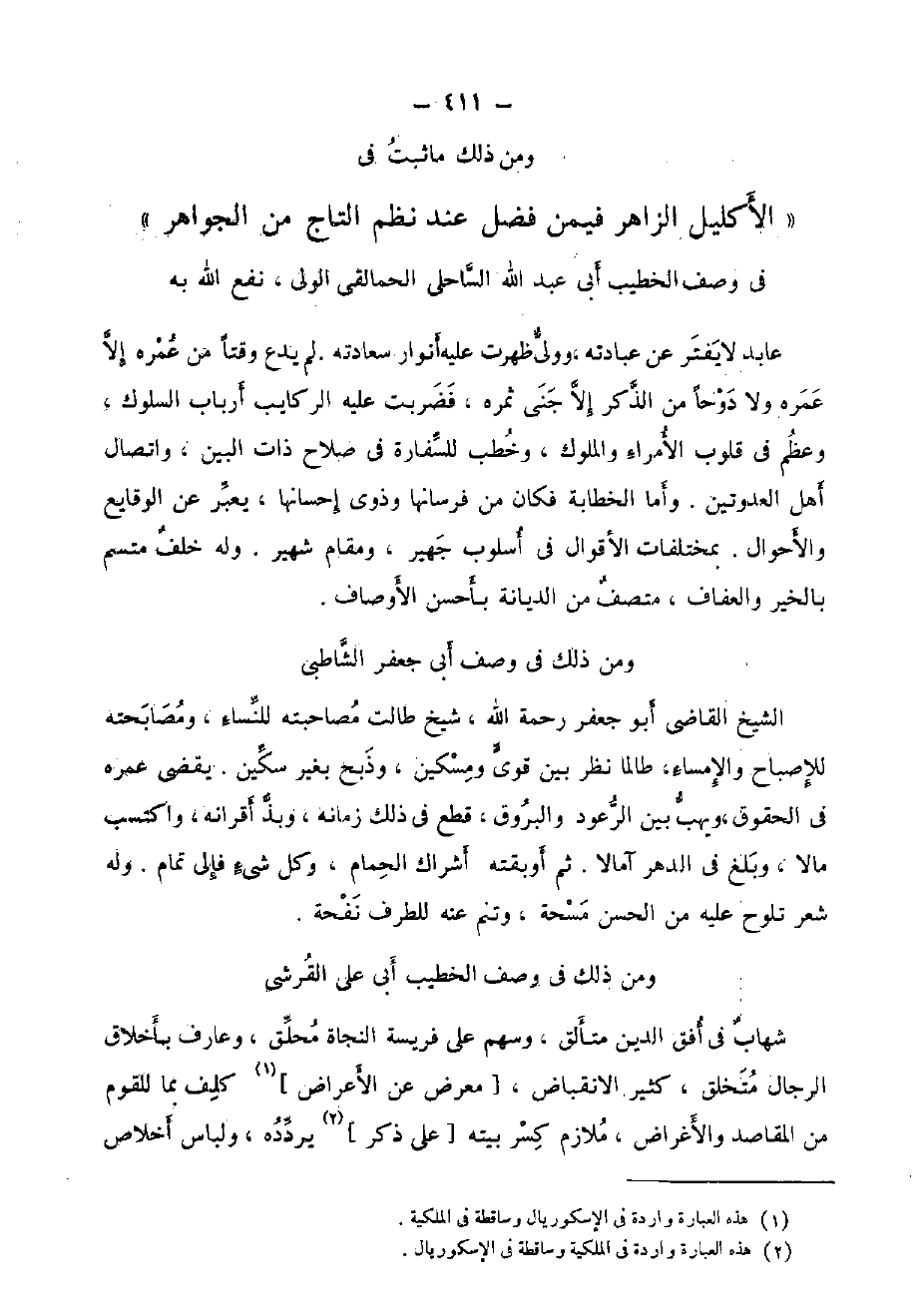 " الأكليل الزَّاهِر فِيمَن فضل عِنْد نظم التَّاج من الْجَوَاهِر " فِي وصف الْخَطِيب أبي عبد الله الساحلي الحمالقى الولى، نفع الله بِهِ