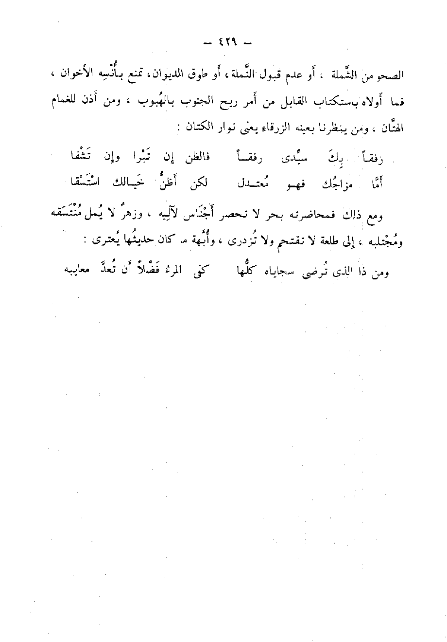 الصحو من الشملة، أَو عدم قبُول النملة، أَو طوق الدِّيوَان، تمنع بأنسه الأخوان، فَمَا أولاه باستكتاب الْقَابِل من أَمر ريح الْجنُوب بالهبوب، وَمن أذن للغمام الهتان، وَمن ينظرنا بِعَيْنِه الزَّرْقَاء يَعْنِي نوار الْكَتَّان:
