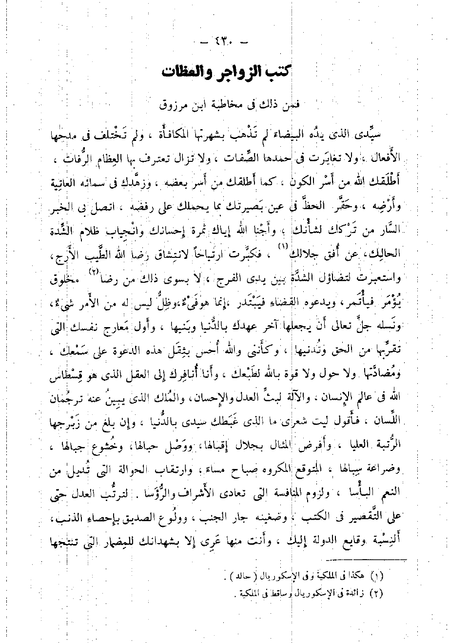 سَيِّدي الَّذِي يَده الْبَيْضَاء لم تذْهب بشهرتها الْمُكَافَأَة. وَلم تخْتَلف فِي مدحها الْأَفْعَال، وَلَا تغايرت فِي حمدها الصِّفَات، وَلَا تزَال تعترف بهَا الْعِظَام الرفات، أطلقك الله من أسر الْكَوْن، كَمَا اطلقك من أسر بعضه، وزهدك فِي سمائه العاتية وأرضه، وحقر الْحَظ فِي عين بصيرتك بِمَا يحملك على رفضه، اتَّصل بِي الْخَبَر السار من تَركك لشأنك، وأجنا الله إياك ثَمَرَة إحسانك وانجياب ظلام الشدَّة الحالك، عَن أفق جلالك، فكبرت ارتياحا لانتشاق رضَا الله الطّيب الأرج، واستعبرت لتضاؤل الشدَّة بَين يَدي الْفرج، لَا بسوى ذَلِك من رضَا مَخْلُوق يُؤمر فيأتمر، ويدعوه الْقَضَاء فيبتدر، إِنَّمَا هُوَ فَيْء، وظل لَيْسَ لَهُ من الْأَمر شَيْء، ونسله جلّ تَعَالَى أَن يَجْعَلهَا آخر عَهْدك بالدنيا وبنيها، وَأول معارج نَفسك الَّتِي تَقربهَا من الْحق وتدنيها، وكأنني وَالله أحس بثقل هَذِه الدعْوَة على سَمعك، ومضادتها وَلَا حول وَلَا قُوَّة بِاللَّه لطبعك، وَأَنا أنافرك إِلَى الْعقل الَّذِي هُوَ قسطاس الله فِي عَالم الْإِنْسَان، والآلة لبث الْعدْل وَالْإِحْسَان، وَالْملك الَّذِي يبين عَنهُ ترجمان اللِّسَان، فَأَقُول لَيْت شعري مَا الَّذِي غبطك سَيِّدي بالدنيا، وَإِن بلغ من زبرجها الرُّتْبَة الْعليا، وأفرض الْمِثَال بِجلَال إقبالها، وَوصل حبالها، وخشوع جبالها، وضراعة سبالها، المتوقع الْمَكْرُوه صباح مسَاء، وارتقاب الْحِوَالَة الَّتِي تديل من النعم البأسا، وَلُزُوم المنافسة الَّتِي تعادي الْأَشْرَاف والرؤسا. لترتب الْعدْل حَتَّى على التَّقْصِير فِي الْكتب، وضغينه جَار الْجنب، وولوع الصّديق بإحصاء الذَّنب، ألنسبة وقايع الدولة إِلَيْك، وَأَنت مِنْهَا عرى إِلَّا بشهدانك للمضمار الَّتِي تنتجها