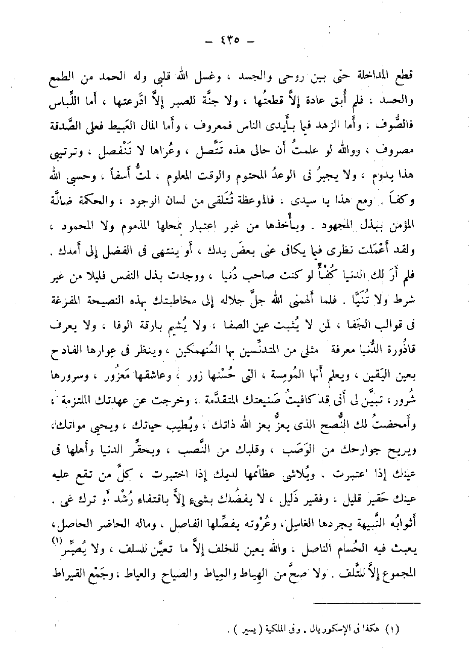 قطع المداخلة حَتَّى بَين روحي والجسد، وَغسل الله قلبِي وَله الْحَمد من الطمع والحسد، فَلم أبق عَادَة إِلَّا قطعتها، وَلَا جنَّة للصبر إِلَّا ادرعتها، أما اللبَاس فالصوف، وَأما الزّهْد فِيمَا بأيدى النَّاس فمعروف، وَأما المَال العبيط فعلى الصَّدَقَة مضروف، وَوَاللَّه لَو علمت أَن حَالي هَذِه تتصل، وعراها لَا تنفصل، وترتيبي هَذَا يَدُوم، وَلَا يجيرنى الْوَعْد المحتوم وَالْوَقْت الْمَعْلُوم، لمت أسفا، وحسبي الله وكفا. وَمَعَ هَذَا يَا سَيِّدي، فالموعظة تتلقى من لِسَان الْوُجُود، وَالْحكمَة ضَالَّة الْمُؤمن ببذل المجهود. ويأخذها من غير اعْتِبَار بمحلها المذموم وَلَا الْمَحْمُود، وَلَقَد أعملت نَظَرِي فِيمَا يكافى عَنى بعض يدك، أَو ينتهى فِي الْفضل إِلَى أمدك. فَلم أر لَك الدُّنْيَا كفأ لَو كنت صَاحب دنيا، وَوجدت بذل النَّفس قَلِيلا من غير شَرط وَلَا تنيا. فَلَمَّا ألهمنى الله جلّ جَلَاله إِلَى مخاطبتك بِهَذِهِ النَّصِيحَة المفرغة فِي قوالب الجفا، لمن لَا يثبت عين الصَّفَا، وَلَا يشيم بارقة الوفا، وَلَا يعرف قاذورة الدُّنْيَا معرفَة مثلى من المتدنسين بهَا المنهمكين، وَينظر فِي عوارها الفادح بِعَين الْيَقِين، وَيعلم أَنَّهَا المومسة، الَّتِي حسنها زور، وعاشقها معزور، وسرورها شرور، تبين لى أَنِّي قد كافيت صنيعتك الْمُتَقَدّمَة، وَخرجت عَن عهدتك الملتزمة، وأمحضت لَك النصح الَّذِي يعز بعز الله ذاتك، ويطيب حياتك، وَيحيى مواتك، ويريح جوارحك من الوصب، وقلبك من النصب، ويحقر الدُّنْيَا وَأَهْلهَا فِي عَيْنك إِذا اعْتبرت، ويلاشى عظائمها لديك إِذا اختبرت، كل من تقع عَلَيْهِ عَيْنك حقير قَلِيل، وفقير ذليل، لَا يفضلك بشئ إِلَّا باقتفاء رشد أَو ترك غي. أثوابه النبيهة يجردها الْغَاسِل، وعروته يفصلها الْفَاصِل، وَمَاله الْحَاضِر الْحَاصِل، يعبث فِيهِ الحسام الناصل، وَالله يعين للخلف إِلَّا مَا تعين للسلف، وَلَا يصير الْمَجْمُوع إِلَّا للتلف. وَلَا صَحَّ من الهياط والمياط والصياح والعياط، وَجمع القيراط