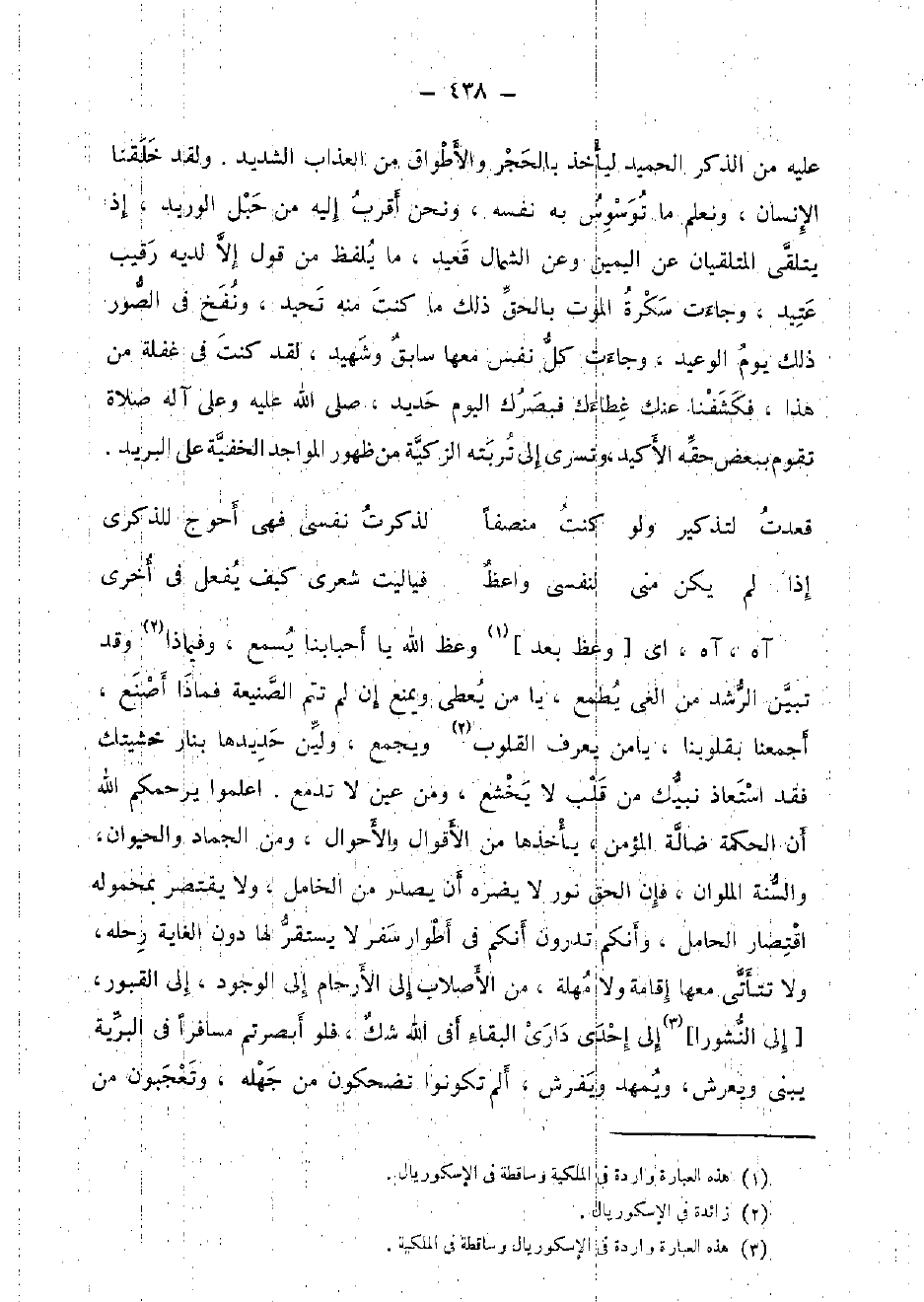 آه، آه، أَي [وعظ بعد] وعظ الله يَا أحبابنا يسمع، وفيماذا وَقد تبين الرشد من الغي يطْمع، يَا من يُعْطي وَيمْنَع إِن لم تتمّ الصنيعة فَمَاذَا أصنع، أجمعنا بقلوبنا، يَا من يعرف الْقُلُوب وَيجمع، ولين حديدها بِنَار خشيتك فقد استعاذ نبيك من قلب لَا يخشع، وَمن عين لَا تَدْمَع. اعلموا يَرْحَمكُمْ الله أَن الْحِكْمَة ضَالَّة الْمُؤمن، يَأْخُذهَا من الْأَقْوَال وَالْأَحْوَال، وَمن الجماد وَالْحَيَوَان، وَالسّنة الملوان، فَإِن الْحق نور لَا يضرّهُ أَن يصدر من الخامل، وَلَا يقْتَصر بمحموله اقْتِصَار الْحَامِل، وأنكم تَدْرُونَ أَنكُمْ فِي أطوار سفر لَا يسْتَقرّ لَهَا دون الْغَايَة رَحْله، وَلَا تتأتى مَعهَا إِقَامَة وَلَا مهلة، من الأصلاب إِلَى الْأَرْحَام إِلَى الْوُجُود، إِلَى الْقُبُور، [إِلَى النشورا] إِلَى إِحْدَى دَاري الْبَقَاء أَفِي الله شكّ، فَلَو أبصرتم مُسَافِرًا فِي الْبَريَّة يَبْنِي ويعرش، ويمهد ويفرش، ألم تَكُونُوا تضحكون من جَهله، وتعجبون من