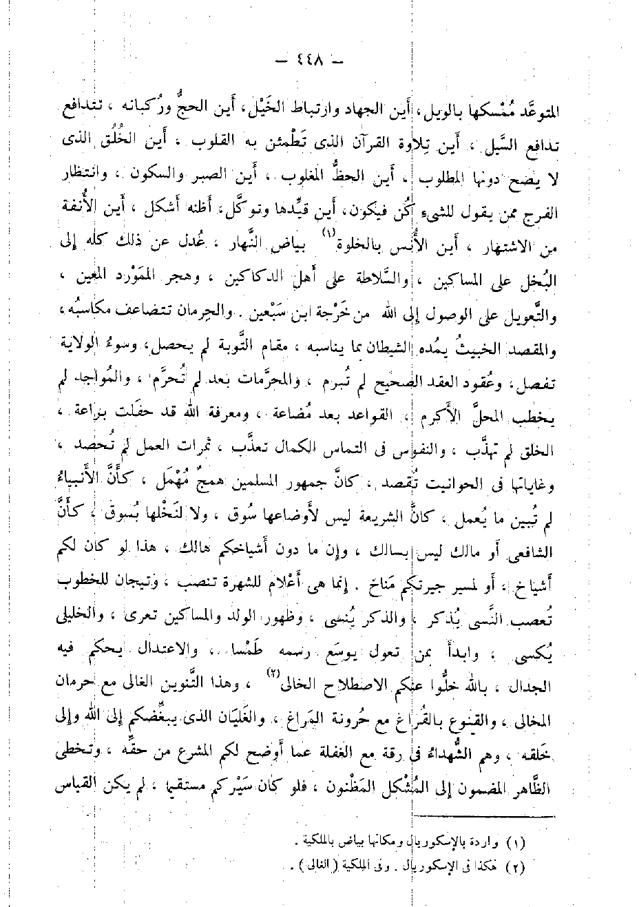 المتوعد ممسكها بِالْوَيْلِ، أَيْن الْجِهَاد وارتباط الْخَيل، أَيْن الْحَج وركبانه، تتدافع تدافع السَّيْل، أَيْن تِلَاوَة الْقُرْآن الَّذِي تطمئِن بِهِ الْقُلُوب، أَيْن الْخلق الَّذِي لَا يَصح دونهَا الْمَطْلُوب، أَيْن الْحَظ المغلوب، أَيْن الصَّبْر والسكون، وانتظار الْفرج مِمَّن يَقُول للشَّيْء كن فَيكون، أَيْن قيدها وتوكل، أَظُنهُ أشكل، أَيْن الأنفة من الاشتهار، أَيْن الْأنس بالخلوة بَيَاض النَّهَار، عدل عَن ذَلِك كُله إِلَى الْبُخْل على الْمَسَاكِين، والسلاطة على أهل الدكاكين، وهجر الممورد الْمعِين، والتعويل على الْوُصُول إِلَى الله من خرجَة ابْن سبعين. والحرمان تتضاعف مكاسبه، والمقصد الْخَبيث يمده الشَّيْطَان بِمَا يُنَاسِبه، مقَام التَّوْبَة لم يحصل، وَسُوء الْولَايَة تفصل، وعقود العقد الصَّحِيح لم تبرم، والمحرمات بعد لم تحرم، والمواجد لم يخْطب الْمحل الأكرم، الْقَوَاعِد بعد مضاعة، وَمَعْرِفَة الله قد حفلت براعة، الْخلق لم تهذب، والنفوس فِي التمَاس الْكَمَال تعذب، ثَمَرَات الْعَمَل لم تحصد، وغاياتها فِي الحوانيت تقصد، كَانَ جُمْهُور الْمُسلمين همج مهمل، كَأَن الْأَنْبِيَاء لم تبين مَا يعْمل، كَانَ الشَّرِيعَة لَيْسَ لأوضاعها سوق، وَلَا لنخلها بسوق، كَأَن الشَّافِعِي أَو مَالك لَيْسَ بسالك، وَإِن مَا دون أشياخكم هَالك، هَذَا لَو كَانَ لكم أَشْيَاخ، أَو لمسير جيرتكم مناخ. إِنَّمَا هِيَ أَعْلَام للشهرة تنصب، وتيجان للخطوب تعصب النسي يذكر، وَالذكر ينسى، وَظُهُور الْوَلَد وَالْمَسَاكِين تعرى، والخليلي يكسى، وابدأ بِمن تعول يُوسع رسمه طمسا، والاعتدال يحكم فِيهِ الْجِدَال، بِاللَّه خلوا عَنْكُم الِاصْطِلَاح الْخَالِي، وَهَذَا التَّنْوِين الغالي مَعَ حرمَان المخالي، والقنوع بالقراغ مَعَ حرونة المراغ، والغليان الَّذِي يبغضكم إِلَى الله وَإِلَى خلقه، وهم الشُّهَدَاء فِي رقة مَعَ الْغَفْلَة عَمَّا أوضح لكم المشرع من حَقه، وتخطى الظَّاهِر الْمَضْمُون إِلَى الْمُشكل المظنون، فَلَو كَانَ سيركم مُسْتَقِيمًا، لم يكن الْقيَاس