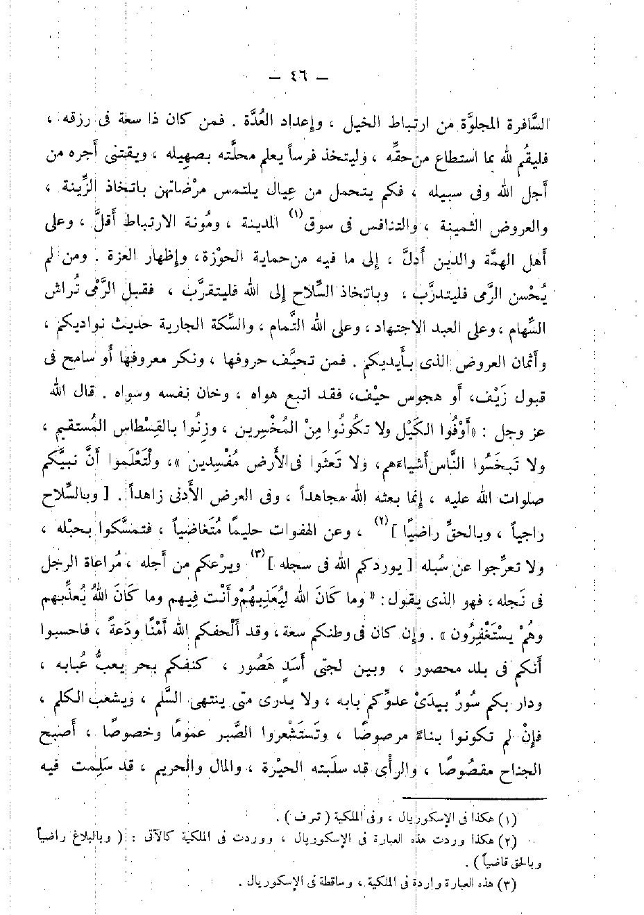 السافرة المجلوة من ارتباط الْخَيل، وإعداد الْعدة. فَمن كَانَ ذَا سعه فِي رزقه، فَليقمْ لله بِمَا اسْتَطَاعَ من حَقه، وليتخذ فرسا يعلم محلته بصهيله، ويقتنى أجره من أجل الله وَفِي سَبيله، فكم يتَحَمَّل من عِيَال يلْتَمس مرضاتهن باتخاذ الزِّينَة، وَالْعرُوض الثمينة، والتنافس فِي سوق الْمَدِينَة، ومونة الارتباط أقل، وعَلى أهل الهمة وَالدّين أدل، إِلَى مَا فِيهِ من حماية الْحَوْزَة، وَإِظْهَار الْعِزَّة. وَمن لم يحسن الرمى فليتدرب، وباتخاذ السِّلَاح إِلَى الله فليتقرب، فَقبل الرمى تراش السِّهَام، وعَلى العَبْد الِاجْتِهَاد، وعَلى الله التَّمام، وَالسِّكَّة الْجَارِيَة حَدِيث نواديكم، وأثمان الْعرُوض الَّذِي بِأَيْدِيكُمْ. فَمن تحيف حروفها، ونكر معروفها أَو سامح فِي قبُول زيف، أَو هجوس حيف، فقد اتبع هَوَاهُ، وخان نَفسه وسواه. قَالَ الله عز وَجل: {أَوْفوا الْكَيْل وَلَا تَكُونُوا من المخسرين وزنوا بالقسطاس الْمُسْتَقيم وَلَا تبخسوا النَّاس أشياءهم وَلَا تعثوا فِي الأَرْض مفسدين} ، ولتعلموا أَن نَبِيكُم صلوَات الله عَلَيْهِ، إِنَّمَا بَعثه الله مُجَاهدًا، وَفِي الْعرض الْأَدْنَى زاهدا. [وبالسلاح راجيا، وبالحق رَاضِيا] ، وَعَن الهفوات حَلِيمًا متغاضيا، فَتمسكُوا بحبله، وَلَا تعرجوا عَن سبله [يوردكم الله فِي سجله] ويرعكم من أَجله، مُرَاعَاة الرجل فِي نجله، فَهُوَ الَّذِي يَقُول: {" وَمَا كَانَ الله ليعذبهم وَأَنت فيهم وَمَا كَانَ الله يعذبهم وهم يَسْتَغْفِرُونَ "} . وَإِن كَانَ فِي وطنكم سَعَة، وَقد ألحفكم الله أمنا ودعة، فأحسبوا أَنكُمْ فِي بلد مَحْصُور، وَبَين لجتي أَسد هصور، كنفكم بَحر يعب عبابه، وَدَار بكم سور بيَدي عَدوكُمْ بَابه، وَلَا يدْرِي مَتى يَنْتَهِي السّلم، ويشعب الْكَلم، فَإِن لم تَكُونُوا بِنَاء مرصوصا، وتستشعروا الصَّبْر عُمُوما وخصوصا، أصبح الْجنَاح مقصوصا، والرأي قد سلبته الْحيرَة، وَالْمَال والحريم، قد سلمت فِيهِ