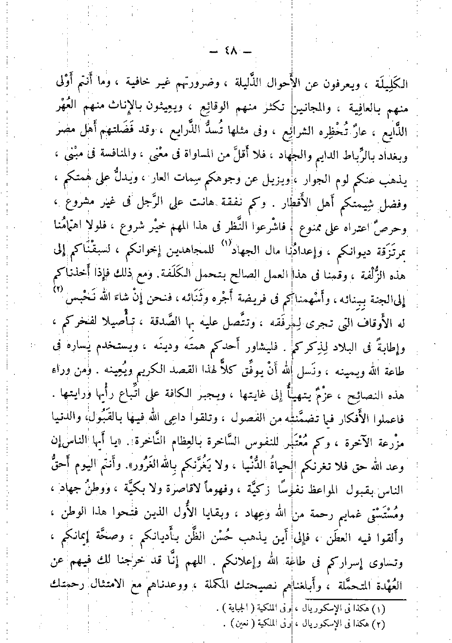 الكليلة، ويعرفون عَن الْأَحْوَال الذليلة، وضرورتهم غير خافية، وَمَا أَنْتُم أولى مِنْهُم بالعافية، والمجانين تكْثر مِنْهُم الوقائع، ويعيثون بالإناث مِنْهُم العهر الذايع، عَار تحظره الشَّرَائِع، وَفِي مثلهَا تسد الذرايع، وَقد فضلتهم أهل مصر وبغداد بالرباط الدايم وَالْجهَاد، فَلَا أقل من الْمُسَاوَاة فِي معنى، والمنافسة فِي مبْنى، يذهب عَنْكُم لوم الْجوَار، ويزيل عَن وُجُوهكُم سمات الْعَار، وَيدل على همتكم، وَفضل شيمتكم أهل الأقطار. وَكم نَفَقَة هَانَتْ على الرجل فِي غير مَشْرُوع، وحرص اعتراه على مَمْنُوع، فاشرعوا النّظر فِي هَذَا المهم خير شُرُوع، فلولا اهتمامنا بمرتزقة ديوانكم، وإعدادنا مَال الْجِهَاد للمجاهدين إخْوَانكُمْ، لسبقناكم إِلَى هَذِه الزلفة، وقمنا فِي هَذَا الْعَمَل الصَّالح بتحمل الكلفة. وَمَعَ ذَلِك فَإِذا أخذناكم إِلَى الْجنَّة ببنائه، وأسهمناكم فِي فَرِيضَة أجره وثنائه، فَنحْن إِن شَاءَ الله نحبس لَهُ الْأَوْقَاف الَّتِي تجْرِي لمرفقه، وتتصل عَلَيْهِ بهَا الصَّدَقَة، تأصيلا لفخركم، وإطابة فِي الْبِلَاد لذكركم. فليشاور أحدكُم همته وَدينه، ويستخدم يسَاره فِي طَاعَة الله وَيَمِينه، ونسل الله أَن يوفق كلا لهَذَا الْقَصْد الْكَرِيم ويعينه. وَمن وَرَاء هَذِه النصائح، عزم يتهيأ إِلَى غايتها، وَيجْبر الكافة على اتِّبَاع رأيها ورايتها. فاعملوا الأفكار فِيمَا تضمنته من الْفُصُول، وتلقوا دَاعِي الله فِيهَا بِالْقبُولِ، وَالدُّنْيَا مزرعة الْآخِرَة، وَكم مُعْتَبر للنفوس الساخرة بالعظام الناخرة. " يَا أَيهَا النَّاس إِن وعد الله حق فَلَا تغرنكم الْحَيَاة الدُّنْيَا، وَلَا يَغُرنكُمْ بِاللَّه الْغرُور ". وَأَنْتُم الْيَوْم أَحَق النَّاس بِقبُول المواعظ نفوسا زكية، وفهوما لَا قَاصِرَة وَلَا بكية، ووطن جِهَاد، ومستسقى غمايم رَحْمَة من الله وعهاد، وبقايا الأول الَّذين فتحُوا هَذَا الوطن، وألقوا فِيهِ العطن، فَإلَى أَيْن يذهب حسن الظَّن بأديانكم، وَصِحَّة إيمَانكُمْ، وتساوى إسراركم فِي طَاعَة الله وإعلانكم. اللَّهُمَّ إِنَّا قد خرجنَا لَك فيهم عَن الْعهْدَة المتحملة، وأبلغناهم نصيحتك المكملة، ووعدناهم مَعَ الِامْتِثَال رحمتك