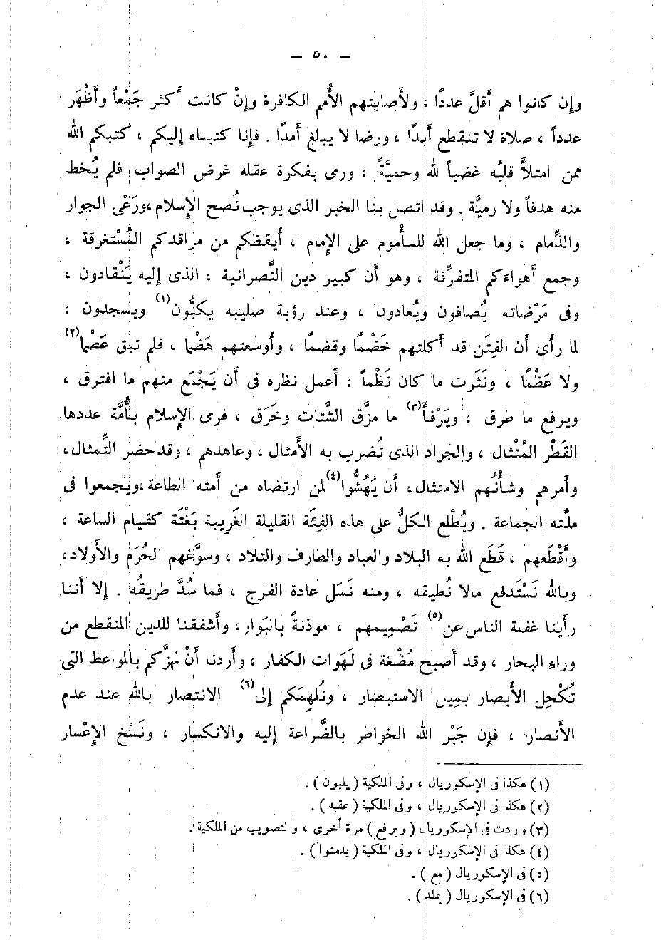 وَإِن كَانُوا هم أقل عددا، ولأصابتهم الْأُمَم الْكَافِرَة وَإِن كَانَت أَكثر جمعا وَأظْهر عددا، صَلَاة لَا تَنْقَطِع أبدا، ورضا لَا يبلغ أمدا. فَإنَّا كتبناه إِلَيْكُم، كتبكم الله مِمَّن امْتَلَأَ قلبه غَضبا لله وحمية، وَرمى بفكرة عقله غَرَض الصَّوَاب فَلم يخط مِنْهُ هدفا وَلَا رمية. وَقد اتَّصل بِنَا الْخَبَر الَّذِي يُوجب نصح الْإِسْلَام، ورعى الْجوَار والذمام، وَمَا جعل الله للْمَأْمُوم على الإِمَام، أيقظكم من مراقدكم المستغرقة، وَجمع أهواءكم المتفرقة، وَهُوَ أَن كَبِير دين النَّصْرَانِيَّة، الَّذِي إِلَيْهِ ينقادون، وَفِي مرضاته يصافون ويعادون، وَعند رُؤْيَة صليبه يكبون ويسجدون، لما رأى أَن الْفِتَن قد أكلتهم خضما وقضما، وأوسعتهم هضما، فَلم تبْق عصما وَلَا عظما، وَنَثَرت مَا كَانَ نظما، أعمل نظره فِي أَن يجمع مِنْهُم مَا افترق، وَيرْفَع مَا طرق، ويرفأ مَا مزق الشتات وخرق، فَرمى الْإِسْلَام بِأمة عَددهَا الْقطر المنثال، وَالْجَرَاد الَّذِي تضرب بِهِ الْأَمْثَال، وعاهدهم، وَقد حضر التمثال، وَأمرهمْ وشأنهم الِامْتِثَال، أَن يهشوا لمن ارْتَضَاهُ من أمته الطَّاعَة، ويجمعوا فِي مِلَّته الْجَمَاعَة. ويطلع الْكل على هَذِه الفئة القليلة الغريبة بَغْتَة كقيام السَّاعَة، وأقطعهم، قطع الله بِهِ الْبِلَاد والعباد والطارف والتلاد، وسوغهم الْحرم وَالْأَوْلَاد، وَبِاللَّهِ نستدفع مَالا نطيقه، وَمِنْه نسل عَادَة الْفرج، فَمَا سد طَرِيقه. إِلَّا أننا رَأينَا غَفلَة النَّاس عَن تصميمهم، موذنة بالبوار، وأشفقنا للدّين الْمُنْقَطع من وَرَاء الْبحار، وَقد أصبح مُضْغَة فِي لَهَوَات الْكفَّار، وأردنا أَن نهزكم بالمواعظ الَّتِي تكحل الْأَبْصَار بميل الاستبصار، ونلهمكم إِلَى الِانْتِصَار بِاللَّه عِنْد عدم الْأَنْصَار، فَإِن جبر الله الخواطر بالضراعة إِلَيْهِ والانكسار، وَنسخ الْإِعْسَار