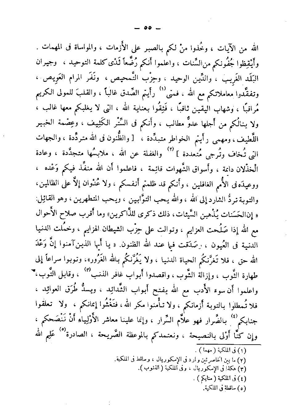 الله من الْآيَات، وخذوا من لكم بِالصبرِ على الأزمات، والمواساة فِي الْمُهِمَّات. وأيقظوا جفونكم من السنات، وَاعْلَمُوا أَنكُمْ رضعا ثدي كلمة التَّوْحِيد، وجيران الْبَلَد الْغَرِيب، وَالدّين الوحيد، وحزب التمحيص، وَنَفر المرام العويص، وتفقدوا معاملاتكم مَعَ الله، فَمَتَى رَأَيْتُمْ الصدْق غَالِبا، وَالْقلب للْمولى الْكَرِيم مراقبا، وشهاب الْيَقِين ثاقبا، فثقوا بعناية الله، الَّتِي لَا يغلبكم مَعهَا غَالب، وَلَا ينالكم من أجلهَا عَدو مطَالب، وأنكم فِي السّتْر الكثيف، وعصمة الْخَبِير اللَّطِيف، ومهمى رَأَيْتُمْ الخواطر متبددة، [والظنون فِي الله مترددة، والجهات الَّتِي تخَاف وترجى مُتعَدِّدَة] والغفلة عَن الله، ملابسها متجددة، وَعَادَة الخذلان دايمة، وأسواق الشَّهَوَات قَائِمَة، فاعلموا أَن الله منفذ فِيكُم وعده، ووعيده فِي الْأُمَم الغافلين، وأنكم قد ظلمتم أَنفسكُم، وَلَا عدوان إِلَّا على الظَّالِمين، وَالتَّوْبَة ترد الشارد إِلَى الله، وَالله يحب التوابين، وَيُحب المتطهرين، وَهُوَ الْقَائِل: {" إِن الْحَسَنَات يذْهبن السَّيِّئَات، ذَلِك ذكرى لِلذَّاكِرِينَ "} وَمَا أقرب صَلَاح الْأَحْوَال مَعَ الله إِذا صلحت العزايم، وتوالت على حزب الشَّيْطَان الهزايم، وخملت الدُّنْيَا الدنية فِي الْعُيُون، وصدقت فِيمَا عِنْد الله الظنون. " {يَا أَيهَا الَّذين آمنُوا إِن وعد الله حق، فَلَا تغرنكم الْحَيَاة الدُّنْيَا، وَلَا يَغُرنكُمْ بِاللَّه الْغرُور "} ، وتوبوا سرَاعًا إِلَى طَهَارَة الثَّوْب، وَإِزَالَة الشوب، واقصدوا أَبْوَاب غَافِر الذَّنب، وقابل التوب، وَاعْلَمُوا أَن سوء الْأَدَب مَعَ الله يفتح أَبْوَاب الشدائد، ويسد طرق العوائد، فَلَا تمطلوا بِالتَّوْبَةِ أزمانكم، وَلَا تأمنوا مكر الله، فتغشوا إيمَانكُمْ، وَلَا تعلقوا جنابكم بالضرار فَهُوَ علام السرَار، وَإِنَّمَا علينا معاشر الْأَوْلِيَاء أَن ننصحكم، وَإِن كُنَّا أولى بِالنَّصِيحَةِ، ونعتمدكم بِالْمَوْعِظَةِ الصَّرِيحَة، الصادرة علم الله