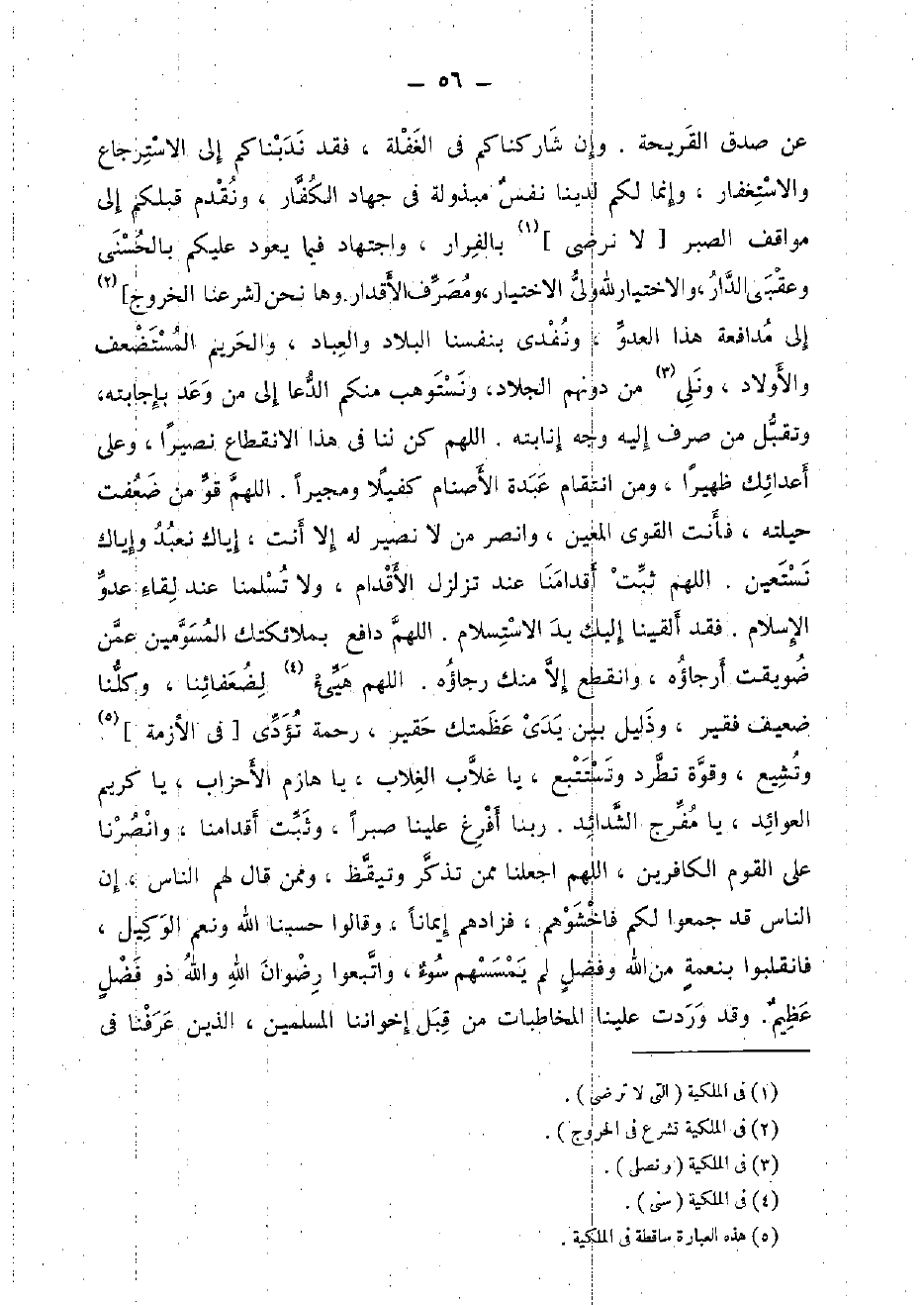 عَن صدق القريحة. وَإِن شاركناكم فِي الْغَفْلَة، فقد ندبناكم إِلَّا الاسترجاع وَالِاسْتِغْفَار، وَإِنَّمَا لكم لدينا نفس مبذولة فِي جِهَاد الْكفَّار، ونقدم قبلكُمْ إِلَى مَوَاقِف الصَّبْر [لَا نرضى] بالفرار، واجتهاد فِيمَا يعود عَلَيْكُم بِالْحُسْنَى وعقبى الدَّار، وَالِاخْتِيَار لله ولي الِاخْتِيَار، ومصرف الأقدار. وَهَا نَحن [شرعنا الْخُرُوج] إِلَى مدافعة هَذَا الْعَدو، ونفدى بنفسنا الْبِلَاد والعباد، والحريم المستضعف وَالْأَوْلَاد، ونلي من دونهم الجلاد، ونستوهب مِنْكُم الدعا إِلَى من وعد بإجابته، وَتقبل من صرف إِلَيْهِ وَجه إنابته. اللَّهُمَّ كن لنا فِي هَذَا الِانْقِطَاع نَصِيرًا، وعَلى أعدائك ظهيرا، وَمن انتقام عَبدة الْأَصْنَام كَفِيلا ومجيرا. اللَّهُمَّ قو من ضعفت حيلته، فَأَنت الْقوي الْمعِين، وانصر من لَا نصير لَهُ إِلَّا أَنْت، إياك نعْبد وَإِيَّاك نستعين، اللَّهُمَّ ثَبت أقدامنا عِنْد تزلزل الْأَقْدَام، وَلَا تسلمنا عِنْد لِقَاء عَدو الْإِسْلَام. فقد ألقينا إِلَيْك يَد الاستسلام. اللَّهُمَّ دَافع بملائكتك المسومين عَمَّن ضويقت أرجاؤه، وَانْقطع إِلَّا مِنْك رجاؤه. اللَّهُمَّ هيىء لضعفائنا، وكلنَا ضَعِيف فَقير، وذليل بَين يَدي عظمتك حقير، رَحْمَة تُؤدِّي [فِي الأزمة] وتشيع، وَقُوَّة تطرد وتستتبع، يَا غلاب الغلاب، يَا هازم الْأَحْزَاب، يَا كريم العوائد، يَا مفرج الشدائد. رَبنَا أفرغ علينا صبرا، وَثَبت أقدامنا، وَانْصُرْنَا على الْقَوْم الْكَافرين، اللَّهُمَّ اجْعَلْنَا مِمَّن تذكر وتيقظ، وَمِمَّنْ قَالَ لَهُم النَّاس، إِن النَّاس قد جمعُوا لكم فَاخْشَوْهُمْ، فَزَادَهُم إِيمَانًا، وَقَالُوا حَسبنَا الله وَنعم الْوَكِيل، فانقلبوا بِنِعْمَة من الله وَفضل لم يمسسهم سوء، وَاتبعُوا رضوَان الله ذُو فضل عَظِيم. وَقد وَردت علينا المخاطبات من قبل إِخْوَاننَا الْمُسلمين الَّذين عرفنَا فِي