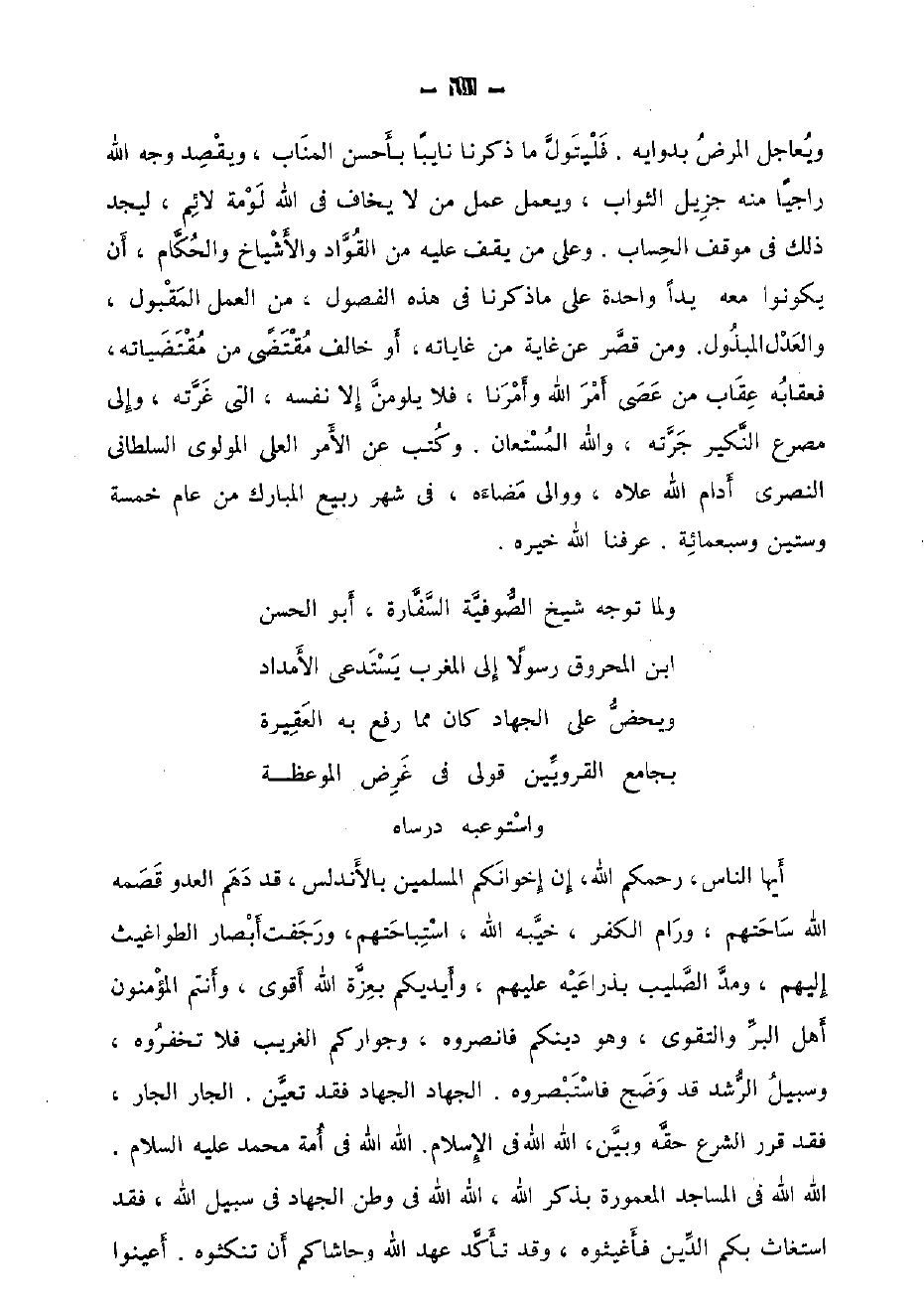 أَيهَا النَّاس، رحمكم الله، إِن إخْوَانكُمْ الْمُسلمين بالأندلس، قد دهم الْعَدو قصمه الله ساحتهم، ورام الْكفْر، خيبه الله، استباحتهم، ورجفت أبصار الطواغيث إِلَيْهِم، وَمد الصَّلِيب بذراعيه عَلَيْهِم، وَأَيْدِيكُمْ بعزة الله أقوى، وَأَنْتُم الْمُؤْمِنُونَ أهل الْبر وَالتَّقوى، وَهُوَ دينكُمْ فانصروه، وجواركم الْغَرِيب فَلَا تخفروه، وسبيل الرشد قد وضح فاستبصروه. الْجِهَاد الْجِهَاد فقد تعين. الْجَار الْجَار، فقد قرر الشَّرْع حَقه وَبَين، الله الله فِي الْإِسْلَام. الله الله فِي أمة مُحَمَّد عَلَيْهِ السَّلَام. الله الله فِي الْمَسَاجِد المعمورة بِذكر الله، الله الله فِي وَطن الْجِهَاد فِي سَبِيل الله، فقد اسْتَغَاثَ بكم الدّين فأغيثوه، وَقد تَأَكد عهد الله وحاشاكم أَن تنكثوه. أعينوا