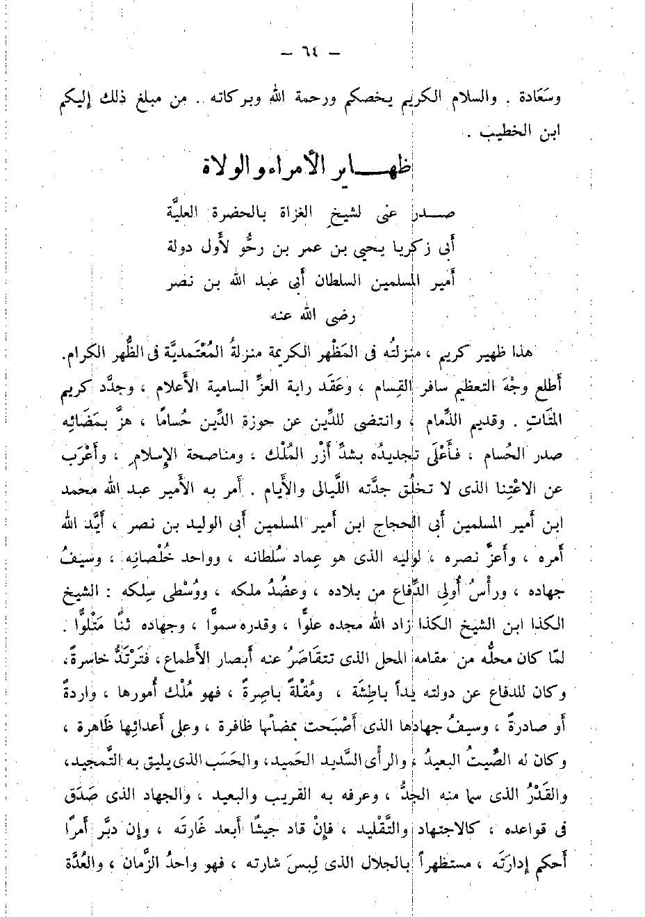 هَذَا ظهير كريم، مَنْزِلَته فِي الْمظهر الْكَرِيمَة منزلَة المعتمدية فِي الظّهْر الْكِرَام. أطلع وَجه التَّعْظِيم سَافر القسام، وَعقد راية الْعِزّ السامية الْأَعْلَام، وجدد كريم المتات. وقديم الذمام، وانتضى للدّين عَن حوزة الدّين حساما، هز بمضائه صدر الحسام، فأعلى تجديده بشد أزر الْملك، ومناصحة الْإِسْلَام، وأعرب عَن الاعتنا الَّذِي لَا تخلق جدته اللَّيَالِي وَالْأَيَّام. أَمر بِهِ الْأَمِير عبد الله مُحَمَّد ابْن أَمِير الْمُسلمين أبي الْحجَّاج ابْن أَمِير الْمُسلمين أبي الْوَلِيد بن نصر، أيد الله أمره، وأعز نَصره، لوَلِيِّه الَّذِي هُوَ عماد سُلْطَانه، وَوَاحِد خلصانه، وَسيف جهاده، وَرَأس أولى الدفاع من بِلَاده، وعضد ملكه، ووسطى سلكه: الشَّيْخ الكذا ابْن الشَّيْخ الكذا زَاد الله مجده علوا، وَقدره سموا، وجهاده ثَنَا متلوا. لما كَانَ مَحَله من مقَامه الْمحل الَّذِي تتقاصر عَنهُ أبصار الأطماع، فترتد خاسرة، وَكَانَ للدفاع عَن دولته يدا باطشة، ومقلة باصرة، فَهُوَ ملك أمورها، وَارِدَة أَو صادرة، وَسيف جهادها الَّذِي أَصبَحت بمضائها ظافرة، وعَلى أعدائها ظَاهِرَة، وَكَانَ لَهُ الصيت الْبعيد، والرأي السديد الحميد، والحسب الَّذِي يَلِيق بِهِ التمجيد، وَالْقدر الَّذِي سما مِنْهُ الْجد، وعرفه بِهِ الْقَرِيب والبعيد، وَالْجهَاد الَّذِي صدق فِي قَوَاعِده، كالاجتهاد والتقليد، فَإِن قاد جَيْشًا أبعد غارته، وَإِن دبر أمرا أحكم إدارته، مستظهرا بالجلال الَّذِي لبس شارته، فَهُوَ وَاحِد الزَّمَان، وَالْعدة
