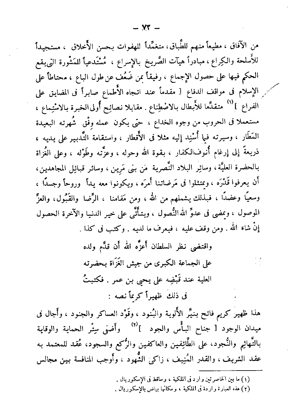 وَاقْتضى نظر السُّلْطَان أعزه الله أَن قدم وَلَده على الْجَمَاعَة الْكُبْرَى من جَيش الْغُزَاة بِحَضْرَتِهِ الْعلية عِنْد قَبضه على يحيى بن عمر. فَكتبت فِي ذَلِك ظهيرا كَرِيمًا نَصه: