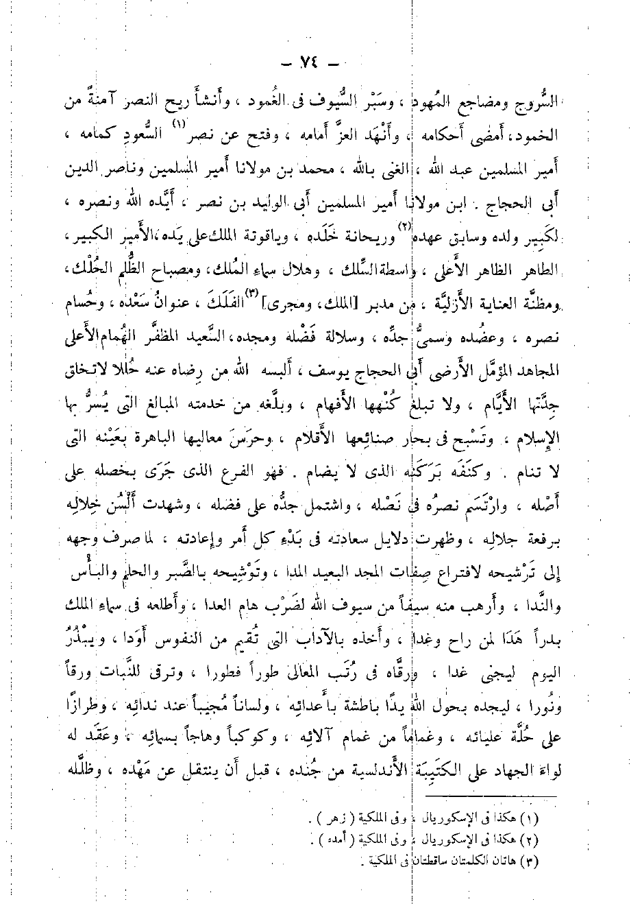 السُّرُوج ومضاجع المهود، وسبر السيوف فِي الغمود، وَأَنْشَأَ ريح النَّصْر آمِنَة من الخمود، أمضى أَحْكَامه، وأنهد الْعِزّ أَمَامه، وَفتح عَن نصر السُّعُود كمامه، أَمِير الْمُسلمين عبد الله، الْغَنِيّ بِاللَّه، مُحَمَّد بن مَوْلَانَا أَمِير الْمُسلمين وناصر الدّين أبي الْحجَّاج. ابْن مَوْلَانَا أَمِير الْمُسلمين أبي الْوَلِيد بن نصر، أيده الله وَنَصره، لكبير وَلَده وسابق عَهده وَرَيْحَانَة خلده، وياقوتة الْملك على يَده، الْأَمِير الْكَبِير، الطَّاهِر الظَّاهِر الْأَعْلَى، وَاسِطَة السلك، وهلال سَمَاء الْملك، ومصباح الظُّلم الحلك، ومظنة الْعِنَايَة الأزلية، من مُدبر [الْملك، ومجري] الْفلك، عنوان سعده، وحسام نَصره، وعضده وسمى جده، وسلالة فَضله ومجده، السعيد المظفر الْهمام الْأَعْلَى الْمُجَاهِد المؤمل الأرضي أبي الْحجَّاج يُوسُف، ألبسهُ الله من رِضَاهُ عَنهُ حللا لَا تخلق جدَّتهَا الْأَيَّام، وَلَا تبلغ كنهها الأفهام، وبلغه من خدمته المبالغ الَّتِي يسر بهَا الْإِسْلَام، وتسبح فِي بحار صنائعها الأقلام، وحرس معاليها الباهرة بِعَيْنِه الَّتِي لَا تنام. وكنفه بركنه الَّذِي لَا يضام. فَهُوَ الْفَرْع الَّذِي جرى بخصله على أَصله، وارتسم نَصره فِي نصله، واشتمل جده على فَضله، وَشهِدت ألسن خلاله برفعة جَلَاله، وَظَهَرت دلايل سعادته فِي بَدْء كل أَمر وإعادته، لما صرف وَجهه إِلَى ترشيحه لافتراع صِفَات الْمجد الْبعيد المدا، وتوشيحه بِالصبرِ والحلم والبأس والندا، وأرهب مِنْهُ سَيْفا من سيوف الله لضرب هام العدا، وأطلعه فِي سَمَاء الْملك بَدْرًا هدا لمن رَاح وَغدا، وَأَخذه بالآداب الَّتِي تقيم من النُّفُوس أودا، ويبذر الْيَوْم ليجنى غَدا، ورقاه فِي رتب الْمَعَالِي طورا فطورا، وترقى للنبات وَرقا ونورا، ليجده بحول الله يدا باطشة بأعدائه، وَلِسَانًا مجيبا عِنْد ندائه، وطرازا على حلَّة عليائه، وغماما من غمام آلائه، وكوكبا وهاجا بسمائه، وَعقد لَهُ لِوَاء الْجِهَاد على الكتيبة الأندلسية من جنده، قبل أَن ينْتَقل عَن مهده، وظلله