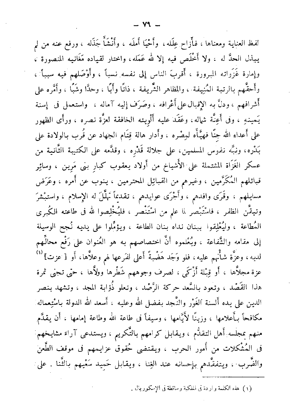 لفظ الْعِنَايَة وَمَعْنَاهَا، فأزاح علله، وَأَحْيَا أمله، وَأَنْشَأَ جذله، وَرفع عَنهُ من لم يبْذل الْحَد لَهُ، وَلَا أخْلص فِيهِ إِلَّا لله عمله، وَاخْتَارَ لقياده مغانيه المنصورة، وإمارة غَزَوَاته المبرورة، أقرب النَّاس إِلَى نَفسه نسبا، وأوصلهم فِيهِ سَببا، وأحقهم بالرتبة المنيفة، والمظاهر الشَّرِيفَة، ذاتا وَأَبا، وحدا وشبا، وَأمره على أَشْرَافهم، وَدلّ بِهِ الإقبال على أعرافه، وَصرف إِلَيْهِ آماله، وَاسْتعْمل فِي إسنة يَمِينه، وَفِي أَعِنَّة شِمَاله، وَعقد عَلَيْهِ ألويته الخافقة لعزة نَصره، وَرَأى الظُّهُور على أَعدَاء الله جنا فهيأه لمصره، وأدار هَالة قتام الْجِهَاد عَن قرب بِالْولادَةِ على بدره وَنبهَ نفوس الْمُسلمين، على جلالة قدره، وَقدمه على الكتيبة الثَّانِيَة من عَسْكَر الْغُزَاة الْمُشْتَملَة على الْأَشْيَاخ من أَوْلَاد يَعْقُوب كبار بني مرين، وَسَائِر قبائلهم الْمُكرمين، وَغَيرهم من الْقَبَائِل المحترمين، يَنُوب عَن أمره، وَعرض مسايلهم، وقرى وافدهم، وأجرى عوايدهم، تَقْدِيمًا تهلل لَهُ الْإِسْلَام، واستبشر وتيقن الظفر، فاستبصر لما علم من استنصر، فليخلصوا لله فِي طَاعَته الْكُبْرَى المطاعة، وليعلقوا ببنان نداه بنان الطَّاعَة، ويؤملوا على يَدَيْهِ نجح الْوَسِيلَة إِلَى مقَامه والشفاعة، ويعلموه أَن اختصاصهم بِهِ هُوَ العنوان على رفع محالهم لَدَيْهِ، وَعزة شَأْنهمْ عَلَيْهِ، فَلَو وجد هضبة أَعلَى لفرعها لَهُم وعلاها، أَو [عزت] عزة مجلاها، أَو قبْلَة أزكى، لصرف وُجُوههم شطرها وولاها، حَتَّى تجني ثَمَرَة هَذَا الْقَصْد، وتعود بالسعد حَرَكَة الرصد، وَتَعْلُو ذؤابة الْمجد، وَتشهد بنصر الدّين على يَده أَلْسِنَة الْغَوْر والنجد بِفضل الله وَعَلِيهِ، أسعد الله الدولة بِاسْتِعْمَالِهِ مكافحا بأعلامها، وزينا لأيامها، وسيفا فِي طَاعَة الله وَطَاعَة إمامها، أَن يقدم مِنْهُم بمجلسه أهل التَّقَدُّم، ويقابل كرامهم بالتكريم، ويستدعي آراء مشايخهم فِي المشكلات من أُمُور الْحَرْب، وَيَقْتَضِي حُقُوق عزايمهم فِي موقف الطعْن وَالضَّرْب، ويتفقدهم بإحسانه عِنْد الْغِنَا، ويقابل حميد سَعْيهمْ بالثنا. على