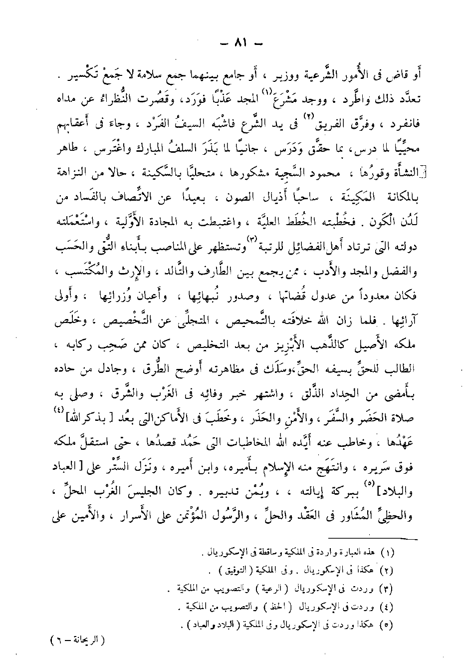 أَو قَاض فِي الْأُمُور الشَّرْعِيَّة ووزير، أَو جَامع بَينهمَا جمع سَلامَة لَا جمع تكسير. تعدد ذَلِك واطرد، وَوجد مشرع الْمجد عذبا فورد، وَقصرت النظراء عَن مداه فَانْفَرد، وَفرق الْفَرِيق فِي يَد الشَّرْع فاشبه السَّيْف الْفَرد، وَجَاء فِي أَعْقَابهم محييا لما درس، بِمَا حقق ودرس، جانيا لما بذر السّلف الْمُبَارك واغترس، طَاهِر النشأة وقورها، مَحْمُود السجية مشكورها، متحليا بِالسَّكِينَةِ، حَالا من النزاهة بالمكانة المكينة، ساحبا أذيال الصون، بَعيدا عَن الاتصاف بِالْفَسَادِ من لدن الْكَوْن. فخطبته الخطط الْعلية، واغتبطت بِهِ المجادة الأولية، واستعملته دولته الَّتِي ترتاد أهل الْفَضَائِل للرتبة وتستظهر على المناصب بأبناء التقى والحسب وَالْفضل وَالْمجد وَالْأَدب، مِمَّن يجمع بَين الطارف والتالد، وَالْإِرْث والمكتسب، فَكَانَ معدودا من عدُول قضاتها، وصدور نبهائها، وأعيان وزرائها، وَأولى آرئها. فَلَمَّا زَان الله خِلَافَته بالتمحيص، المتجلي عَن التَّخْصِيص، وخلص ملكه الْأَصِيل كالذهب الأبزيز من بعد التخليص، كَانَ مِمَّن صحب ركابه، الطَّالِب للحق بِسَيْفِهِ الْحق، وسلك فِي مظاهرته أوضح الطّرق، وجادل من حاده بأمضى من الْحداد الذلق، واشتهر خبر وفائه فِي الغرب والشرق، وَصلى بِهِ صَلَاة الْحَضَر وَالسّفر، والأمن والحذر، وخطب فِي الْأَمَاكِن الَّتِي بعد [بِذكر الله] عهدها، وخاطب عَنهُ أيده الله المخاطبات الَّتِي حمد قَصدهَا، حَتَّى اسْتَقل ملكه فَوق سَرِيره، وانتهج مِنْهُ الْإِسْلَام بأميره، وَابْن أميره، وَنزل السّتْر على [الْعباد والبلاد] ببركة إيالته، ويمن تَدْبيره. وَكَانَ الجليس الغرب الْمحل، والحظى المشاور فِي العقد والحل، وَالرَّسُول المؤتمن على الْأَسْرَار، والأمين على