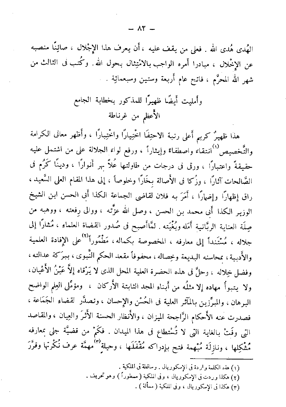 هَذَا ظهير كريم أَعلَى رُتْبَة الاحتفا اخْتِيَارا واختبارا، وَأظْهر مَعَاني الْكَرَامَة والتخصيص انتقاء واصطفاء وإيثارا، وَرفع لِوَاء الْجَلالَة على من اشْتَمَل عَلَيْهِ حَقِيقَة واعتبارا، ورقى فِي دَرَجَات من طاولتها علا بهر أنوارا، ودينا كرم فِي الصَّالِحَات آثارا، وزكا فِي الْأَصَالَة بخارا وخلوصا، إِلَى هَذَا الْمقَام الْعلي السعيد، راق إِظْهَارًا وإضمارا، أَمر بِهِ فلَان لقَاضِي الْجَمَاعَة الكذا أبي الْحسن ابْن الشَّيْخ الْوَزير الكذا أبي مُحَمَّد بن الْحسن، وصل الله عزته، ووالى رفعته، ووهبه من صلَة الْعِنَايَة الربانية أمله وبغيته. لما أصبح فِي صُدُور الْقُضَاة الْعلمَاء، مشارا إِلَى جَلَاله، مُسْتَندا إِلَى معارفه، الْمَخْصُوصَة بِكَمَالِهِ، مطمورا على الإفادة العلمية والأدبية، بمحاسنه البديعة وخصاله، محفوفا مقْعد الحكم النَّبَوِيّ، ببركة عَدَالَته، وَفضل خلاله، وَحل فِي هَذِه الحضرة الْعلية الْمحل الَّذِي لَا يرقاه إِلَّا عين الْأَعْيَان، وَلَا يتبوأ مهاده إِلَّا مثله من أَبنَاء الْمجد الثَّابِتَة الْأَركان، ومؤملي الْعلم الْوَاضِح الْبُرْهَان، والمبرزين بالمآثر الْعلية فِي الْحسن وَالْإِحْسَان، وتصدر لقَضَاء الْجَمَاعَة، فصدرت عَنهُ الْأَحْكَام الراجحة الْمِيزَان، والأنظار الْحَسَنَة الْأَثر والعيان، والمقاصد الَّتِي وفت بالغاية الَّتِي لَا تستطاع فِي هَذَا الميدان. فكم من قَضِيَّة جلى بمعارفه مشكلها، ونازلة مُبْهمَة فتح بإدراكه مقفلها، وحيلة مهمة عرف نكرتها وَقرر