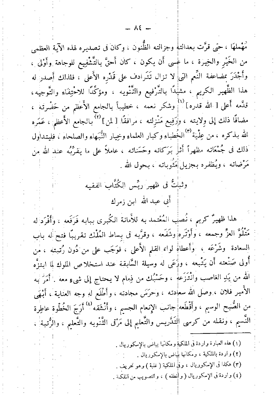 وَثَبت فِي ظهير ريس الْكتاب الْفَقِيه أبي عبد الله ابْن زمرك هَذَا ظهير كريم، نصب الْمُعْتَمد بِهِ للأمانة الْكُبْرَى بِبَابِهِ فرفعه، وأفرد لَهُ متلو الْعِزّ وَجمعه، وأوتره وشفعه، وقربه فِي بِسَاط الْملك تَقْرِيبًا فتح لَهُ بَاب السَّعَادَة وشرعه، وَأَعْطَاهُ لِوَاء الْقَلَم الْأَعْلَى، فَوَجَبَ على من دون رتبته، من أولى صَنعته أَن يتبعهُ، ورعى لَهُ وَسِيلَة السَّابِقَة عِنْد استخلاص الْمُلُوك لما ابتزه الله من يَد الْغَاصِب وانتزعه، وحسبك من ذمام لَا يحْتَاج إِلَى شَيْء مَعَه. أَمر بِهِ الْأَمِير فلَان، وصل الله سعادته، وحرس مجادته، وأطلع لَهُ وَجه الْعِنَايَة، أبهى من الصُّبْح الوسيم، وأقطعه جَانب الإنعام الجسيم، وأنشقه أرج الخطوة عاطرة النسيم، وَنَقله من كرْسِي التدريس والتعليم إِلَى مرقى الثنويه والتعليم، والرتبة،