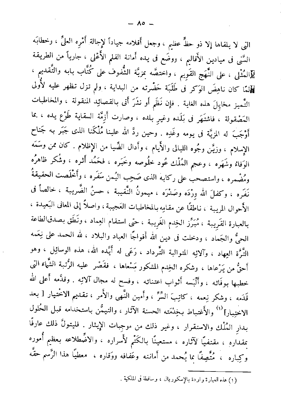 الَّتِي لَا يلقاها إِلَّا ذُو حَظّ عَظِيم، وَجعل أقلامه جيادا لإجالة أمره الْعلي، وخطابه السّني فِي ميادين الأقاليم، وَوضع فِي يَده أَمَانَة الْقَلَم الْأَعْلَى، جَارِيا من الطَّرِيقَة المثلى، على النهج القويم، واختصه بمزية الشفوف على كتاب بَابه والتقديم، لما كَانَ ناهض الوكر فِي طلبة حَضرته من الْبِدَايَة، وَلم تزل تظهر عَلَيْهِ لأولى التميز مخايل هَذِه الْغَايَة. فَإِن نظم أَو نثر أَتَى بالقصائد المنقولة، والمخاطبات المصقولة، فاشتهر فِي بَلَده وَغير بَلَده، وَصَارَت أزمة السِّقَايَة طوع يَده، بِمَا أوجب لَهُ المزية فِي يَوْمه وغده. وَحين رد الله علينا ملكنا الَّذِي جبر بِهِ جنَاح الْإِسْلَام، وزين وُجُوه اللَّيَالِي وَالْأَيَّام، وأدال الضيا من الإظلام. كَانَ مِمَّن وسمه الْوَفَاء وشهره، وعجم الْملك عود خلوصه وَخَبره، فَحَمدَ أَثَره، وشكر ظَاهره ومضمره، واستصحب على ركابه الَّذِي صحب الْيمن سَفَره، وأخلصت الْحَقِيقَة نفره، وكفل الله ورده وصدره، مَيْمُون النقيبة، حسن الضريبة، خَالِصا فِي الْأَحْوَال المريبة، ناطقا عَن مقَامه بالمخاطبات العجيبة، واصلا إِلَى الْمعَانِي الْبَعِيدَة، بالعبارة الْقَرِيبَة، مبرز الخدم الغريبة، حَتَّى استقام الْعِمَاد، ونطق بِصدق الطَّاعَة الْحَيّ والجماد، وَدخلت فِي دين الله أَفْوَاجًا الْعباد والبلاد، لله الْحَمد على نعمه الترة العهاد، وآلائه المتوالية الترداد، رعى لَهُ أيده الله، هَذِه الْوَسَائِل، وَهُوَ أَحَق من يرعاها، وشكره الخدم المشكور مسعاها، فقصر عَلَيْهِ الرُّتْبَة الشماء الَّتِي خطبهَا بوفائه، وَألبسهُ أَثوَاب اعتنائه، وفسح لَهُ مجَال آلائه. وَقدمه أَعلَى الله قدمه، وشكر نعمه، كَاتب السِّرّ، وَأمين النهى وَالْأَمر، تَقْدِيم الِاخْتِيَار [بعد الاختبار] والأغتباط بخدمته الْحَسَنَة الْآثَار، والتيمن باستخدامه قبل الْحُلُول بدار الْملك والاستقرار، وَغير ذَلِك من مُوجبَات الإيثار. فليتول ذَلِك عَارِفًا بمقداره، مقتفيا لآثاره، مستعينا بالكتم لأسراره، والاضطلاعه بعظيم أُمُوره وكباره، متصفا بِمَا يحمد من أَمَانَته وعفافه ووقاره، معطيا هَذَا الرَّسْم حَقه