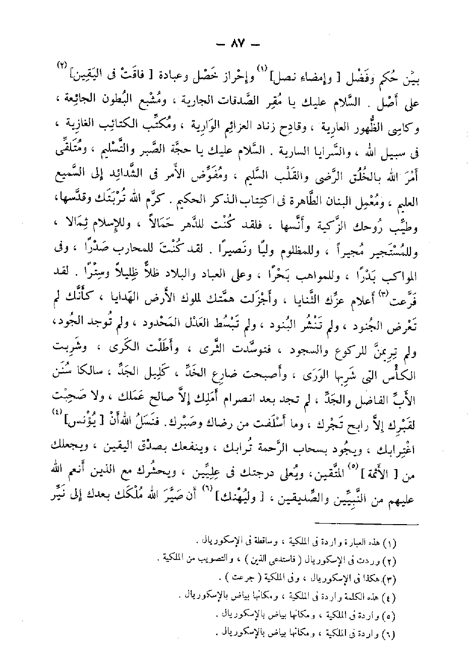 بَين حكم وَفضل [وإمضاء نصل] وإحراز خصل وَعبادَة [فاقت فِي الْيَقِين] على أصل. السَّلَام عَلَيْك يَا مقرّ الصَّدقَات الْجَارِيَة، ومشبع الْبُطُون الجائعة، وكاسي الظُّهُور الْعَارِية، وقادح زناد العزائم الوارية، ومكتب الْكَتَائِب الغازية، فِي سَبِيل الله، والسرايا السارية. السَّلَام عَلَيْك يَا حجَّة الصَّبْر وَالتَّسْلِيم، ومتلقى أَمر الله بالخلق الرضى وَالْقلب السَّلِيم، ومفوض الْأَمر فِي الشدائد إِلَى السَّمِيع الْعَلِيم، ومعمل البنان الطاهرة فِي اكتتاب الذّكر الْحَكِيم. كرم الله تربتك وقدسها، وَطيب روحك الزكية وأنسها، فَلَقَد كنت للدهر حمالا، وللإسلام ثمالا، وللمستجير مجيرا، وللمظلوم وليا ونصيرا. لقد كنت للمحارب صَدرا، وَفِي المواكب بَدْرًا، وللمواهب بحرا، وعَلى الْعباد والبلاد ظلا ظليلا وسترا. لقد فرعت أَعْلَام عزك الثنايا، وأجزلت همتك لملوك الأَرْض الْهَدَايَا، كَأَنَّك لم تعرض الْجنُود، وَلم تنشر البنود، وَلم تبسط الْعدْل الْمَحْدُود، وَلم تُوجد الْجُود، وَلم تريمن للرُّكُوع وَالسُّجُود، فتوسدت الثرى، وأطلت الْكرَى، وشربت الكأس الَّتِي شربهَا الورى، وأصبحت ضارع الخد، كليل الْجد، سالكا سنَن الْأَب الْفَاضِل وَالْجد، لم تَجِد بعد انصرام أملك إِلَّا صَالح عَمَلك، وَلَا صَحِبت لقبرك إِلَّا رابح تجرك، وَمَا أسلفت من رضاك وصبرك. فنسل الله أَن [يؤنس] اغترابك، ويجود بسحاب الرَّحْمَة ترابك، وينفعك بِصدق الْيَقِين، ويجعلك من [الْأَئِمَّة] الْمُتَّقِينَ، ويعلى درجتك فِي عليين، ويحشرك مَعَ الَّذين أنعم الله عَلَيْهِم من النَّبِيين وَالصديقين، [وليهنك] أَن صير الله ملكك بعْدك إِلَى نير
