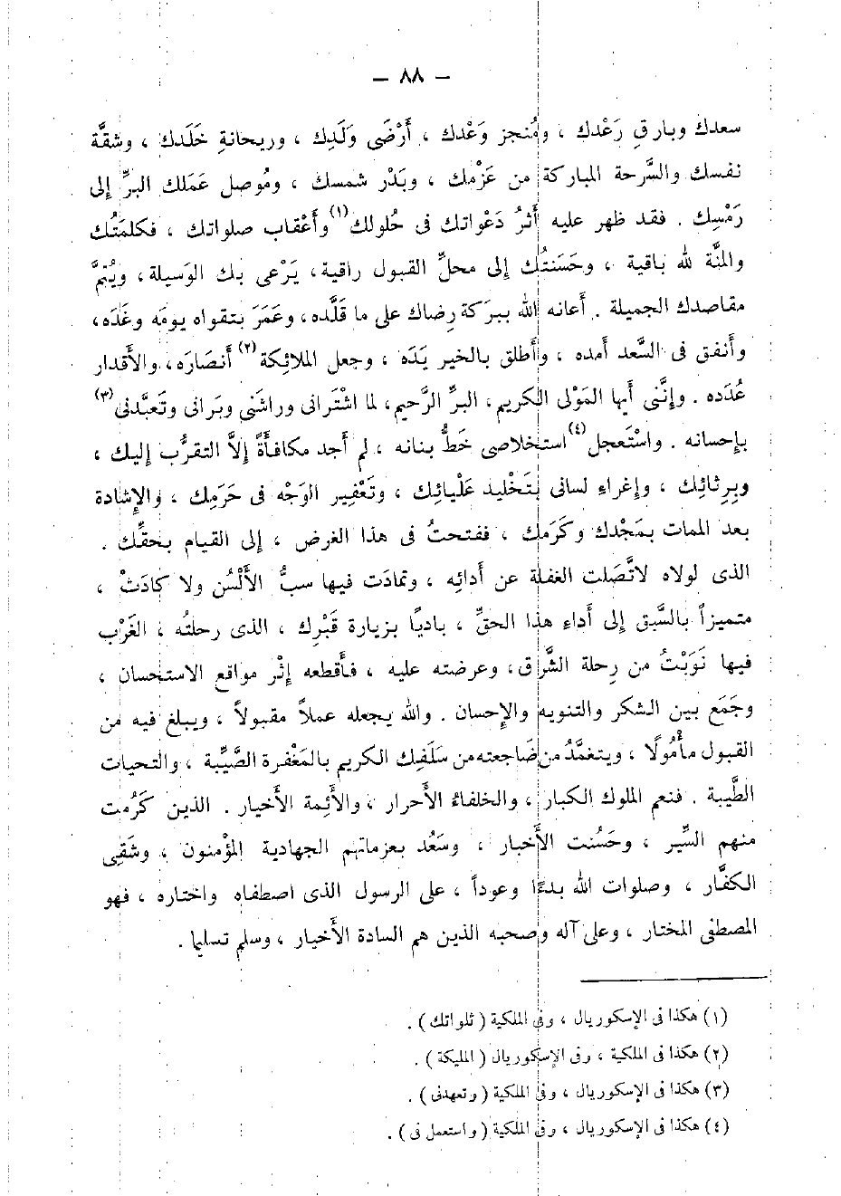 سعدك وبارق رعدك، ومنجز وَعدك، أرْضى ولدك، وَرَيْحَانَة خلدك، وشقة نَفسك والسرحة الْمُبَارَكَة من عزمك، وَبدر شمسك، وموصل عَمَلك الْبر إِلَى رمسك. فقد ظهر عَلَيْهِ أثر دعواتك فِي حلولك وأعقاب صلواتك، فكلمتك والْمنَّة لله بَاقِيَة، وحسنتك إِلَى مَحل الْقبُول راقية، يرْعَى بك الْوَسِيلَة، وَيتم مقاصدك الجميلة، أَعَانَهُ الله ببركة رضاك على مَا قَلّدهُ، وَعمر بتقواه يَوْمه وغده، وَأنْفق فِي السعد أمده، وَأطلق بِالْخَيرِ يَده، وَجعل الْمَلَائِكَة أنصاره، والأقدار عدده. وإنني أَيهَا الْمولى الْكَرِيم، الْبر الرَّحِيم، لما اشتراني وراشني وبراني وتعبدني بإحسانه. واستعجل استخلاصي خطّ بنانه، لم أجد مُكَافَأَة إِلَّا التَّقَرُّب إِلَيْهِ، وبرثائك، وإغراء لساني بتخليد عليائك، وتعفير الْوَجْه فِي حَرمك، والإشادة بعد الْمَمَات بمجدك وكرمك، ففتحت فِي هَذَا الْغَرَض، إِلَى الْقيام بحقك. الَّذِي لولاه لاتصلت الْغَفْلَة عَن أَدَائِهِ، وتمادت فِيهَا سبّ الألسن وَلَا كَادَت، متميزا بِالسَّبقِ إِلَى أَدَاء هَذَا الْحق، باديا بزيارة قبرك، الَّذِي رحلته، الغرب فِيهَا نوبت من رحْلَة الشرق، وعرضته عَلَيْهِ، فأقطعه إِثْر مواقع الِاسْتِحْسَان، وَجمع بَين الشُّكْر والتنويه وَالْإِحْسَان. وَالله يَجعله عملا مَقْبُولًا، ويبلغ فِيهِ من الْقبُول مأمولا، ويتغمد من ضاجعته من سلفك الْكَرِيم بالمغفرة الصيبة، والتحيات الطّيبَة. فَنعم الْمُلُوك الْكِبَار، وَالْخُلَفَاء الْأَحْرَار، وَالْأَئِمَّة الأخيار. الَّذين كرمت مِنْهُم السّير، وَحسنت الْأَخْبَار، وَسعد بعزماتهم الجهادية الْمُؤْمِنُونَ، وشقى الْكفَّار، وصلوات الله بدءا وعودا، على الرَّسُول الَّذِي اصطفاه وَاخْتَارَهُ، فَهُوَ الْمُصْطَفى الْمُخْتَار، وعَلى آله وَصَحبه الَّذين هم السَّادة الأخيار، وَسلم تَسْلِيمًا.