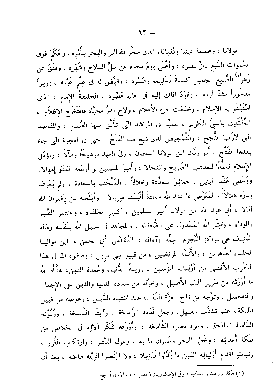 مَوْلَانَا، وعصمة ديننَا ودنيانا، الَّذِي سخر الله الْبر وَالْبَحْر بأَمْره، وَحكم فَوق السَّمَوَات السَّبع بعز نَصره، وأغنى يَوْم سعده عَن سل السِّلَاح وشهره، وفتق عَن زهر الصَّنِيع الْجَمِيل كمامة تَسْلِيمه وَصَبره، وقيض لَهُ فِي علم غيبه، وزيرا مذخورا لشد أزره، وقود الْملك إِلَيْهِ فِي حَال عصره، الْخَلِيفَة الإِمَام، الَّذِي استبشر بِهِ الْإِسْلَام، وخفقت لعزه الْأَعْلَام، ولاح بدر محياه فافتضح الإظلام، الْمُقْتَدِي بِالنَّبِيِّ الْكَرِيم، سميه فِي المراشد الَّتِي تألق مِنْهَا الصُّبْح، والمقاصد الَّتِي لازمها النجح، والتمحيص الَّذِي تبع مِنْهُ الْمنح، حَتَّى فِي الْهِجْرَة الَّتِي جَاءَ بعْدهَا الْفَتْح، أَبُو زيان ابْن مَوْلَانَا السُّلْطَان، ولي الْعَهْد ترشيحا ومآلا، ومؤمل الْإِسْلَام تقلدا للْمَذْهَب الصَّرِيح وانتحالا، وأمير الْمُسلمين لَو أوسعه الْقدر إمهالا، ووسطى عقد الْبَنِينَ، خلائق مُتعَدِّدَة وخلالا، المتحف بالسعادة، وَلم يعرف بدره هلالا، المعوض بِمَا عِنْد الله سَعَادَة ألبسته سربالا، وأبلغته من رضوَان الله آمالا، أَبى عبد الله ابْن مَوْلَانَا أَمِير الْمُسلمين، كَبِير الْخُلَفَاء، وعنصر الصَّبْر وَالْوَفَاء، وَستر الله المسدول على الضُّعَفَاء، والمجاهد فِي سَبِيل الله بِنَفسِهِ وَمَاله المنيف على مراكز النُّجُوم بهمه وآماله، الْمُقَدّس أبي الْحسن، ابْن موالينا الْخُلَفَاء الطاهرين، وَالْأَئِمَّة المرتضين، من قبيل بني مرين، وصفوة الله فِي هَذَا الْمغرب الْأَقْصَى من أوليائه الْمُؤمنِينَ، وزينة الدُّنْيَا، وعمدة الدّين، هنأه الله مَا أورثه من سَرِير الْملك الْأَصِيل، وخوله من سَعَادَة الدُّنْيَا وَالدّين على الْإِجْمَال وَالتَّفْصِيل، وَتوجه من تَاج الْعِزَّة القعساء عِنْد اشْتِبَاه السَّبِيل، وعوضه من قبيل المليكة، عِنْد تشَتت الْقَبِيل، وَجعل قدمه الراسخة، وآيته الناسخة، وربوته السامية الباذخة، وَعزة نَصره الشامخة، وأوزعه شكر آلائه فِي الْخَلَاص من ملكه أعدائه، وخطر الْبَحْر وعدوان مَا بِهِ، وغول السّفر، وارتكاب الْغرَر، وثبات أَقْدَام أوليائه الَّذين مَا بدلُوا تبديلا، وَلَا ارتضوا لقبلة طَاعَته، بعد أَن