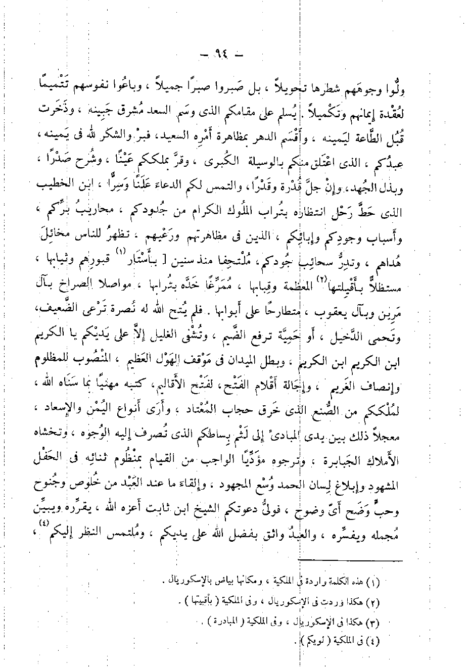 ولوا وُجُوههم شطرها تحويلا، بل صَبَرُوا صبرا جميلا، وَبَاعُوا نُفُوسهم تتميما لعقدة إِيمَانهم وتكميلا. يسلم على مقامكم الَّذِي وسم السعد مشرق جَبينه، وذخرت قبل الطَّاعَة ليمينه، وَأقسم الدَّهْر بمظاهرة أمره السعيد، فبر وَالشُّكْر لله فِي يَمِينه، عبدكم، الَّذِي اعتلق مِنْكُم بالوسيلة الْكُبْرَى، وقر بملككم عينا، وَشرح صَدرا، وبذل الْجهد، وَإِن جلّ قدرَة وَقدرا، وَالْتمس لكم الدُّعَاء علنا وسرا، ابْن الْخَطِيب الَّذِي حط رَحل انْتِظَاره بِتُرَاب الْمُلُوك الْكِرَام من جدودكم، محاريب بركم، وَأَسْبَاب وجودكم وإبائكم، الَّذين فِي مظاهرتهم ورعيهم، تظهر للنَّاس مخائل هدَاهُم، وتدر سحائب جودكم، ملتحفا مُنْذُ سِنِين [بِأَسْتَارِ قُبُورهم وثيابها، مستظلا بأقيلتها المعظمة وقبابها، ممرغا خَدّه بترابها، مواصلا الصُّرَاخ بآل مرين وبآل يَعْقُوب، متطارحا على أَبْوَابهَا. فَلم يتح الله لَهُ نصْرَة ترعى الضَّعِيف، وتحمى الدخيل، أَو حمية ترفع الضيم، وتشفي الغليل إِلَّا على يديكم يَا الْكَرِيم ابْن الْكَرِيم ابْن الْكَرِيم، وَبَطل الميدان فِي موقف الهول الْعَظِيم، الْمَنْصُوب للمظلوم وإنصاف الْغَرِيم، وإجالة أَقْلَام الْفَتْح، لفتح الأقاليم، كتبه مهنيا بِمَا سناه الله، لملككم من الصنع الَّذِي خرق حجاب الْمُعْتَاد، وَأرى أَنْوَاع الْيمن والإسعاد، معجلا ذَلِك بَين يَدي المبادئ إِلَى لثم بساطكم الَّذِي تصرف إِلَيْهِ الْوُجُوه، وتخشاه الْأَمْلَاك الْجَبَابِرَة، وترجوه مُؤديا الْوَاجِب من الْقيام بمنظوم ثنائه فِي الحفل الْمَشْهُود وإبلاغ لِسَان الْحَمد وسع المجهود، وإلقاء مَا عِنْد العَبْد من خلوص وجنوح وَحب وضح أَي وضوح، فولى دعوتكم الشَّيْخ ابْن ثَابت أعزه الله، يقرره وَيبين مجمله ويفسره، وَالْعَبْد واثق بِفضل الله على يديكم، وملتمس النّظر إِلَيْكُم،