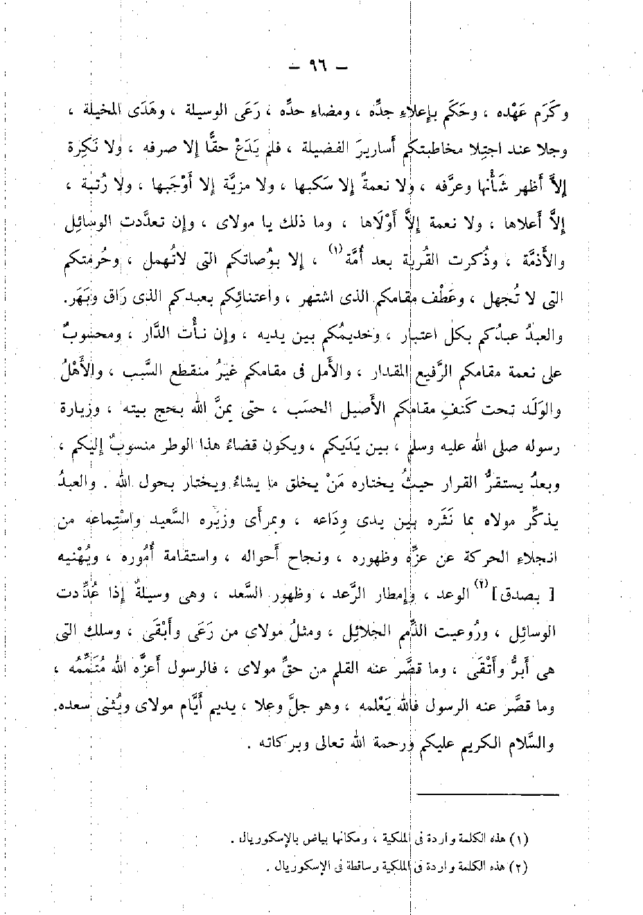 وكرم عَهده، وَحكم بإعلاء جده، ومضاء حَده، رعى الْوَسِيلَة، وَهدى المخيلة، وجلا عِنْد اجتلا مخاطبتكم أسارير الْفَضِيلَة، فَلم يدع حَقًا إِلَّا صرفه، وَلَا نكرَة إِلَّا أظهر شَأْنهَا وعرفه، وَلَا نعْمَة إِلَّا سكبها، وَلَا مزية إِلَّا أوجبهَا، وَلَا رُتْبَة، إِلَّا أَعْلَاهَا، وَلَا نعْمَة إِلَّا أولاها، وَمَا ذَلِك يَا مولَايَ، وَإِن تعدّدت الْوَسَائِل والأذمة، وَذكرت الْقرْبَة بعد أمة، إِلَّا بوصاتكم الَّتِي لَا تهمل، وحرمتكم الَّتِي لَا تجْهَل، وَعطف مقامكم الَّذِي اشْتهر، واعتنائكم بعبدكم الَّذِي راق وبهر. وَالْعَبْد عبدكم بِكُل اعْتِبَار، وخديمكم بَين يَدَيْهِ، وَإِن نأت الدَّار، ومحسوب على نعْمَة مقامكم الرفيع الْمِقْدَار، والأمل فِي مقامكم غير مُنْقَطع السَّبَب، والأهل وَالْولد تَحت كنف مقامكم الْأَصِيل الْحسب، حَتَّى يمن الله بِحَجّ بَيته، وزيارة رَسُوله [صلى الله عَلَيْهِ وَسلم] ، بَين يديكم، وَيكون قَضَاء هَذَا الوطر مَنْسُوب إِلَيْكُم، وَبعد يسْتَقرّ الْقَرار حَيْثُ يختاره من يخلق مَا يَشَاء ويختار بحول الله. وَالْعَبْد يذكر مَوْلَاهُ بِمَا نثره بَين يَدي وداعه، وبمرأى وزيره السعيد واستماعه من انجلاء الْحَرَكَة عَن عزه وظهوره، ونجاح أَحْوَاله، واستقامة أُمُوره، ويهنيه [بِصدق] الْوَعْد، وإمطار الرَّعْد، وَظُهُور السعد، وَهِي وَسِيلَة إِذا عددت الْوَسَائِل، وروعيت الذمم الجلائل، وَمثل مولَايَ من رعى وَأبقى، وسلك الَّتِي هِيَ أبر وَأتقى، وَمَا قصر عَنهُ الْقَلَم من حق مولَايَ، فالرسول أعزه الله متممه، وَمَا قصر عَنهُ الرَّسُول فَالله يُعلمهُ، وَهُوَ جلّ وَعلا، يديم أَيَّام مولَايَ ويثني سعده. وَالسَّلَام الْكَرِيم عَلَيْكُم وَرَحْمَة الله تَعَالَى وَبَرَكَاته.