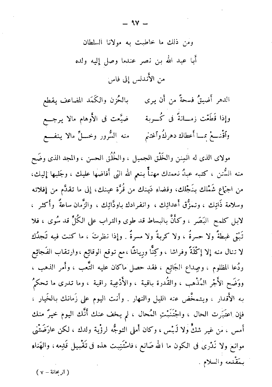 وَمن ذَلِك مَا خاطبت بِهِ مَوْلَانَا السُّلْطَان أَبَا عبد الله بن نصر عِنْدَمَا وصل إِلَيْهِ وَلَده من الأندلس إِلَى فاس