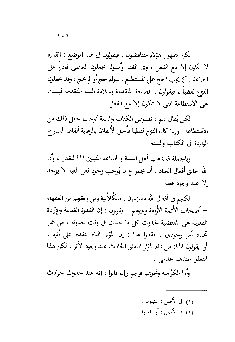 لكنهم في أفعال الله متنازعون فالكلابية ومن وافقهم من الفقهاء أصحاب الأئمة الأربعة وغيرهم يقولون إن القدرة القديمة والإرادة القديمة هي المقتضية لحدوث كل ما حدث في وقت حدوثه من غير تجدد أمر وجودي فقالوا هنا إن المؤثر التام يتقدم على أثره أو يقولون من تمام المؤثر التعلق الحادث عند وجود الأثر لكن هذا التعلق عندهم عدمي.