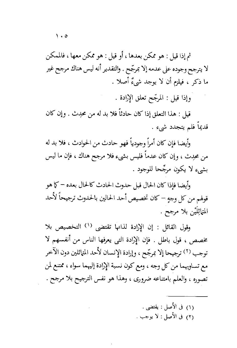 وقول القائل: إن الإرادة لذاتها تقتضي التخصيص بلا مخصص قول باطل فإن الإرادة التي يعرفها الناس من أنفسهم لا توجب ترجيحا إلا بمرجح وإرادة الإنسان لأحد المتماثلين دون الآخر مع تساويهما من كل وجه ومع كون نسبة الإرادة إليهما سواء ممتنع لمن تصوره والعلم بامتناعه ضروري وهذا هو نفس الترجيح بلا مرجح.