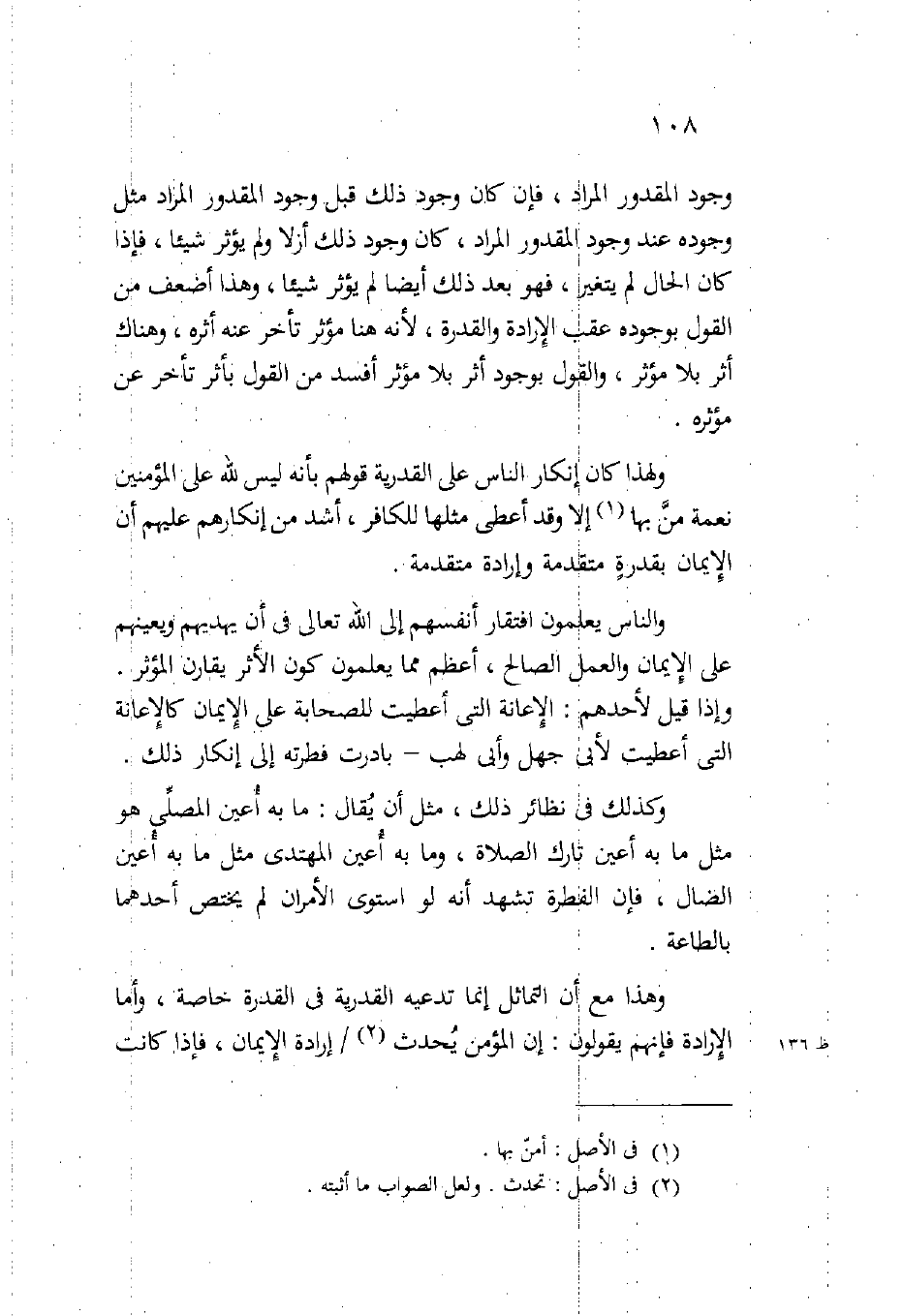 ولهذا كان إنكار الناس على القدرية قولهم بأنه ليس لله على المؤمنين نعمة من بها إلا وقد أعطى مثلها للكافر أشد من إنكارهم عليهم أن الإيمان بقدرة متقدمة وإرادة متقدمة.