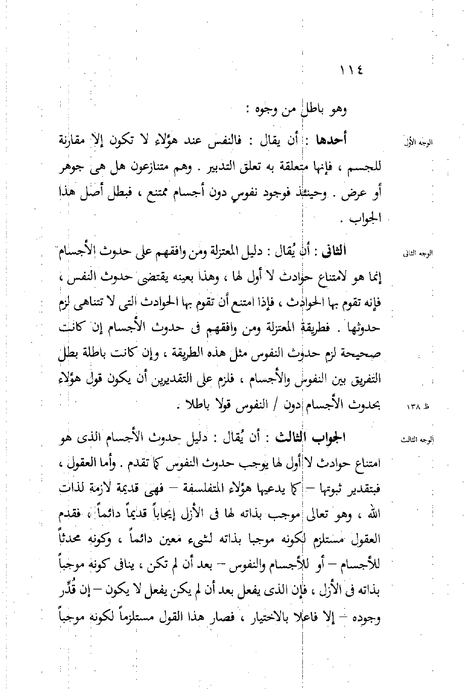 الثاني: أن يقال دليل المعتزلة ومن وافقهم على حدوث الأجسام إنما هو لامتناع حوادث لا أول لها وهذا بعينه يقتضي حدوث النفس فإنه تقوم بها الحوادث فإذا امتنع أن تقوم بها الحوادث التي لا تتناهى لزم حدوثها فطريقة المعتزلة ومن وافقهم في حدوث الأجسام إن كانت صحيحة لزم حدوث النفوس مثل هذه الطريقة وإن كان باطلة بطل التفريق بين النفوس والأجسام فلزم على التقديرين أن يكون قول هؤلاء بحدوث الأجسام دون النفوس قولا باطلا.