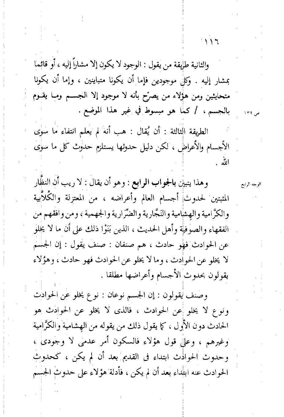 وهذا يتبين بالجواب الرابع: وهو أن يقال لا ريب أن النظار المثبتين لحدوث أجسام العالم وأعراضه من المعتزلة والكلابية والكرامية والهشامية والنجارية والضرارية والجهمية ومن وافقهم من الفقهاء والصوفية وأهل الحديث الذين بنوا ذلك على أن ما لا يخلو عن الحوادث فهو حادث هم صنفان صنف يقول إن الجسم لا يخلو عن الحوادث وما لا يخلو عن الحوادث فهو حادث وهؤلاء يقولون بحدوث الأجسام وأعراضها مطلقا.