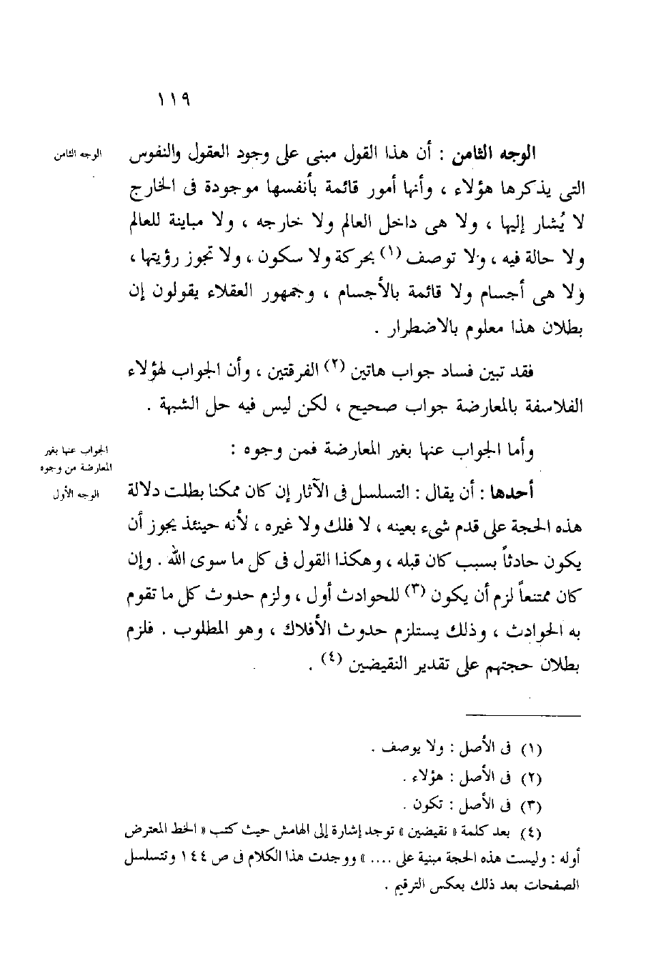أحدها: أن يقال التسلسل في الآثار إن كان ممكنا بطلت دلالة هذه الحجة على قدم شيء بعينه لا فلك ولا غيره لأنه حينئذ يجوز أن يكون حادثا بسبب كان قبله وهكذا القول في كل ما سوى الله وإن كان ممتنعا لزم أن يكون للحوادث أول ولزم حدوث كل ما تقوم به الحوادث وذلك يستلزم حدوث الأفلاك وهو المطلوب فلزم بطلان حجتهم على تقدير النقيضين.