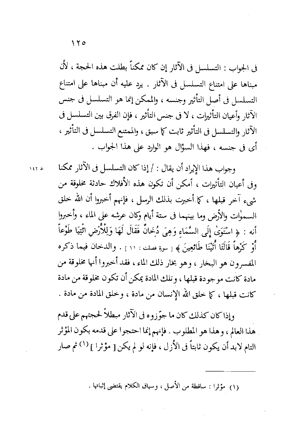 في الجواب: التسلسل في الآثار إن كان ممكنا بطلت هذه الحجة لأن مبناها على امتناع التسلسل في الآثار يرد عليه أن مبناها على امتناع التسلسل في أصل التأثير وجنسه والممكن إنما هو التسلسل في جنس الآثار وأعيان التأثيرات لا في جنس التأثير فإن الفرق بين التسلسل في الآثار والتسلسل في التأثير ثابت كما سبق والممتنع التسلسل في التأثير أي في جنسه فهذا السؤال هو الوارد على هذا الجواب.