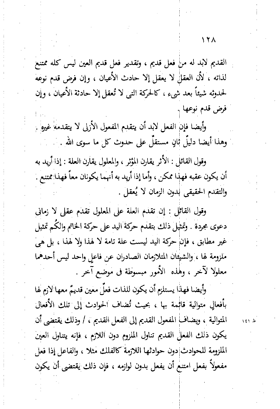 وأيضا فهذا يستلزم أن يكون للذات فعل معين قديم معها لازم لها بأفعال متوالية قائمة بها بحيث تضاف الحوادث إلى تلك الأفعال المتوالية ويضاف المفعول القديم إلى الفعل القديم وذلك يقتضي أن يكون ذلك الفعل القديم تناول الملزوم دون اللازم فإنه يتناول العين الملزومة للحوادث دون حوادثها اللازمة كالفلك مثلا والفاعل إذا فعل مفعولا بفعل امتنع أن يفعل بدون لوازمه فإن ذلك يقتضي أن يكون