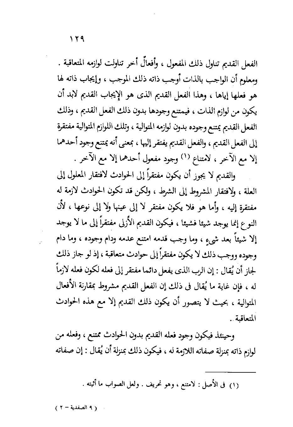 الفعل القديم تناول ذلك المفعول وأفعال أخر تناولت لوزامه المتعاقبة ومعلوم أن الواجب بالذات أوجب ذاته ذلك الموجب وإيجاب ذاته لها هو فعلها إياها وهذا الفعل القديم الذي هو الإيجاب القديم لا بد أن يكون من لوازم الذات فيمتنع وجودها بدون ذلك الفعل القديم وذلك الفعل القديم يمتنع وجوده بدون لوزامه المتوالية وتلك اللوازم المتوالية مفتقرة إلى الفعل القديم والفعل القديم يفتقر إليها بمعنى أنه يمتنع وجود أحدهما إلا مع الآخر لامتناع وجود مفعول أحدهما إلا مع الآخر.
