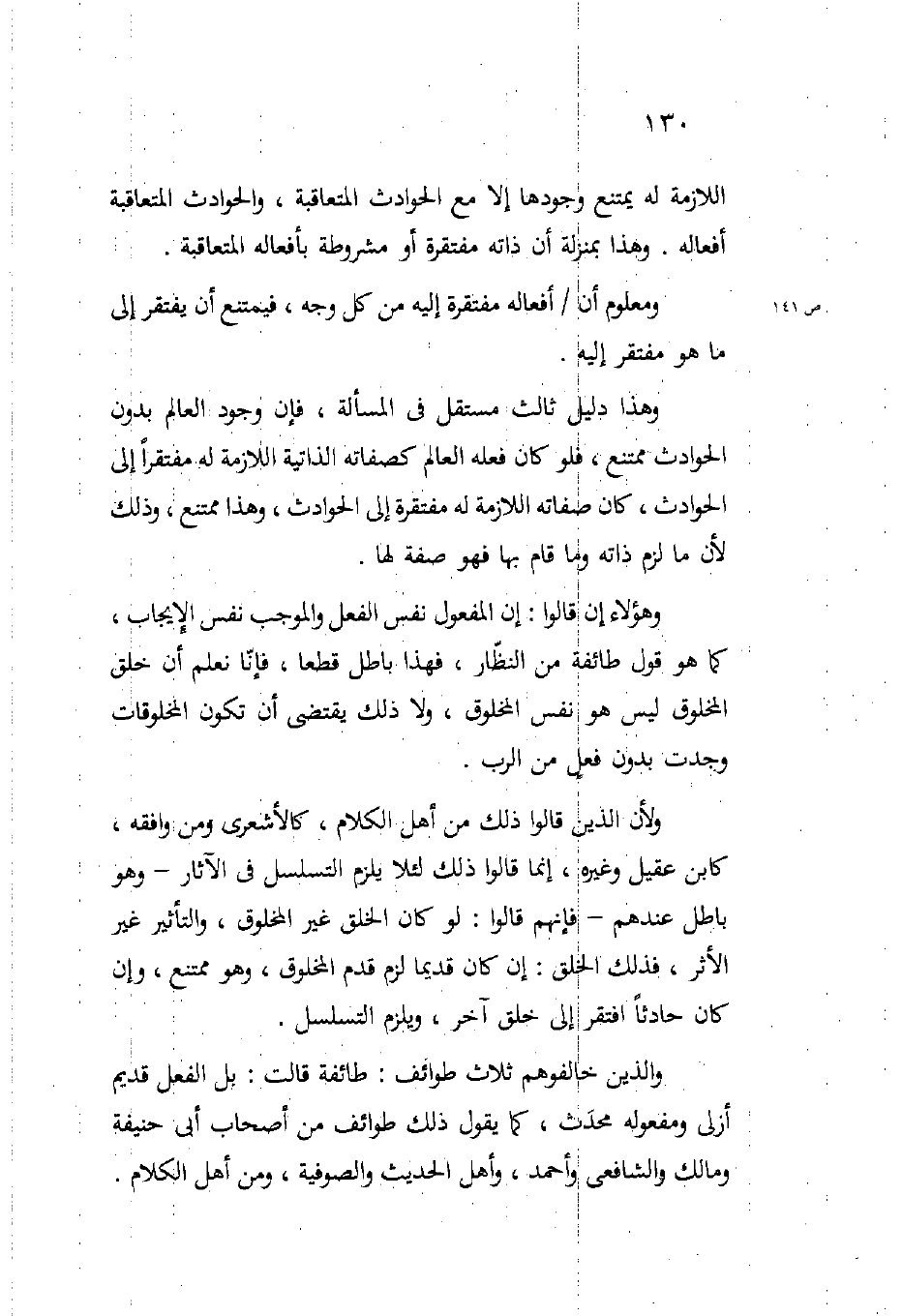 اللازمة له يمتنع وجودها إلا مع الحوادث المتعاقبة والحوادث المتعاقبة أفعاله وهذا بمنزلة أن ذاته مفتقرة أو مشروطة بأفعاله المتعاقبة.