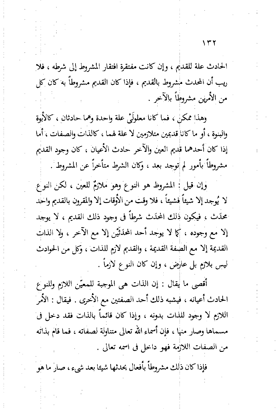 وإن قيل: المشروط هو النوع وهو ملازم للعين لكن النوع لا يوجد إلا شيئا فشيئا فلا وقت من الأوقات إلا والمقرون بالقديم واحد محدث فيكون ذلك المحدث شرطا في وجود ذلك القديم لا يوجد إلا مع وجوده كما لا يوجد أحد المحدثين إلا مع الآخر ولا الذات القديمة إلا مع الصفة القديمة والقديم لازم للذات وكل من الحوادث ليس بلازم بل عارض وإن كان النوع لازما.