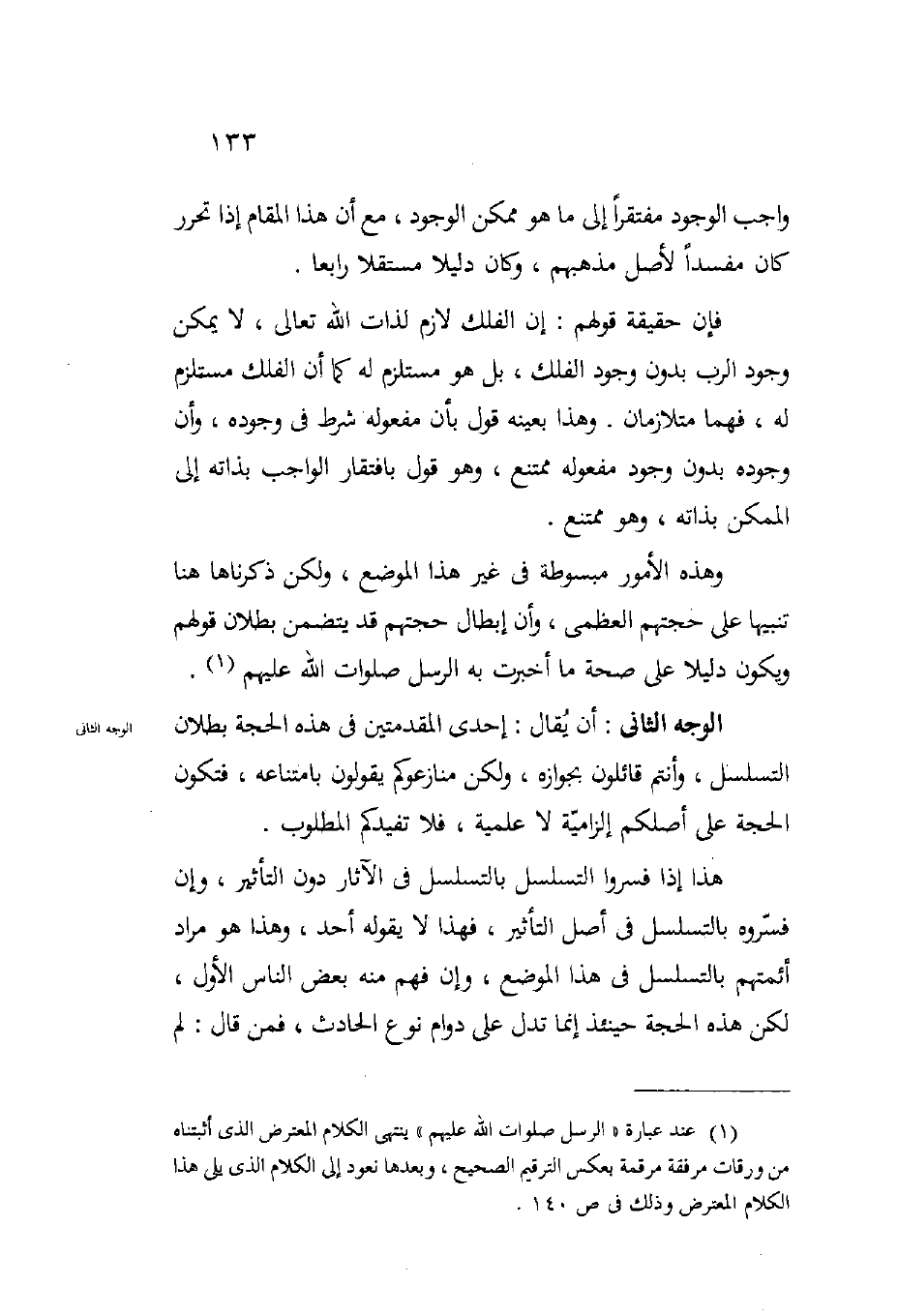 الوجه الثاني: أن يقال إحدى المقدمتين في هذه الحجة بطلان التسلسل وأنتم قائلون بجوازه ولكن منازعوكم يقولون بامتناعه فتكون الحجة على أصلكم إلزامية لا علمية فلا تفيدكم المطلوب.
