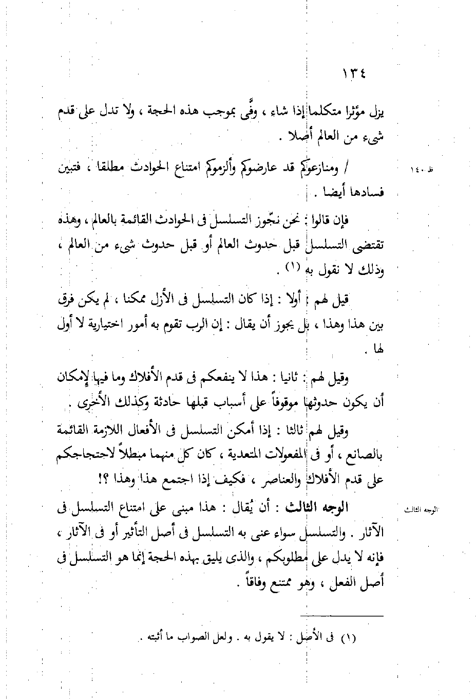 الوجه الثالث أن يقال هذا مبني على امتناع التسلسل في الآثار والتسلسل سواء عنى به التسلسل في أصل التأثير أو في الآثار فإنه لا يدل على مطلوبكم والذي يليق بهذه الحجة إنما هو التسلسل في أصل الفعل وهو ممتنع وفاقا