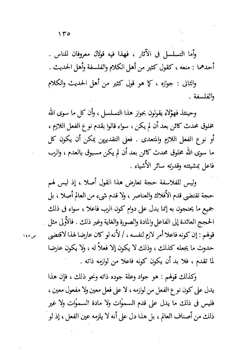 وأما التسلسل في الآثار فهذا فيه قولان معروفان للناس أحدهما منعه كقول كثير من أهل الكلام والفلسفة وأهل الحديث.