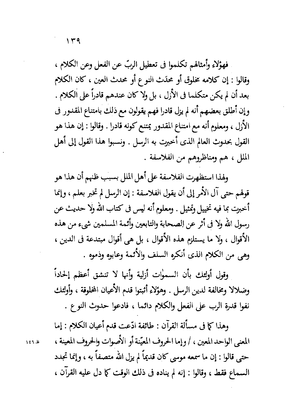 فهؤلاء وأمثالهم تكلموا في تعطيل الرب عن الفعل وعن الكلام وقالوا إن كلامه مخلوق أو محدث النوع أو محدث العين كان الكلام بعد أن لم يكن متكلما في الأزل بل ولا كان عندهم قادرا على الكلام وإن أطلق بعضهم أنه لم يزل قادرا فهم يقولون مع ذلك بامتناع المقدور في الأزل ومعلوم أنه مع امتناع المقدور يمتنع كونه قادرا وقالوا إن هذا هو القول بحدوث العالم الذي أخبرت به الرسل ونسبوا هذا القول إلى أهل الملل هم ومناظروهم من الفلاسفة.