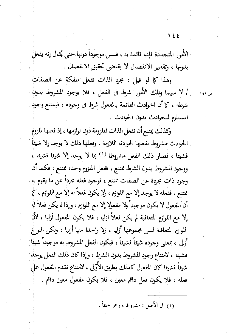 وكذلك يمتنع أن تفعل الذات الملزومة دون لوازمها إذ فعلها لملزوم الحوادث مشروط بفعلها لحوادثه اللازمة وفعلها ذلك لا يوجد إلا شيئا فشيئا فصار ذلك الفعل مشروطا بما لا يوجد إلا شيئا فشيئا ووجود المشروط بدون الشرط ممتنع ففعل الملزوم وحده ممتنع فكما أن وجود ذات مجردة عن الصفات ممتنع فوجود فعله مجردا عن ما يقوم به ممتنع ففعله لا يوجد إلا مع اللوازم ولا يكون فعلا له إلا مع اللوازم كما أن المفعول لا يكون موجودا ولا مفعولا إلا مع اللوازم وإذا لم يكن فعلا له إلا مع اللوازم المتعاقبة لم يكن فعلا أزليا فلا يكون المفعول أزليا لأن اللوازم المتعاقبة ليس مجموعها أزليا ولا واحدا منها أزليا ولكن النوع أزلي بمعنى وجوده شيئا فشيئا فيكون الفعل المشروط به موجودا شيئا فشيئا لامتناع وجود المشروط بدون الشرط وإذا كان ذلك الفعل يوجد شيئا فشيئا كان المفعول كذلك بطريق الأولى لامتناع تقدم المفعول على فعله فلا يكون فعل دائم معين فلا يكون مفعول معين دائم.
