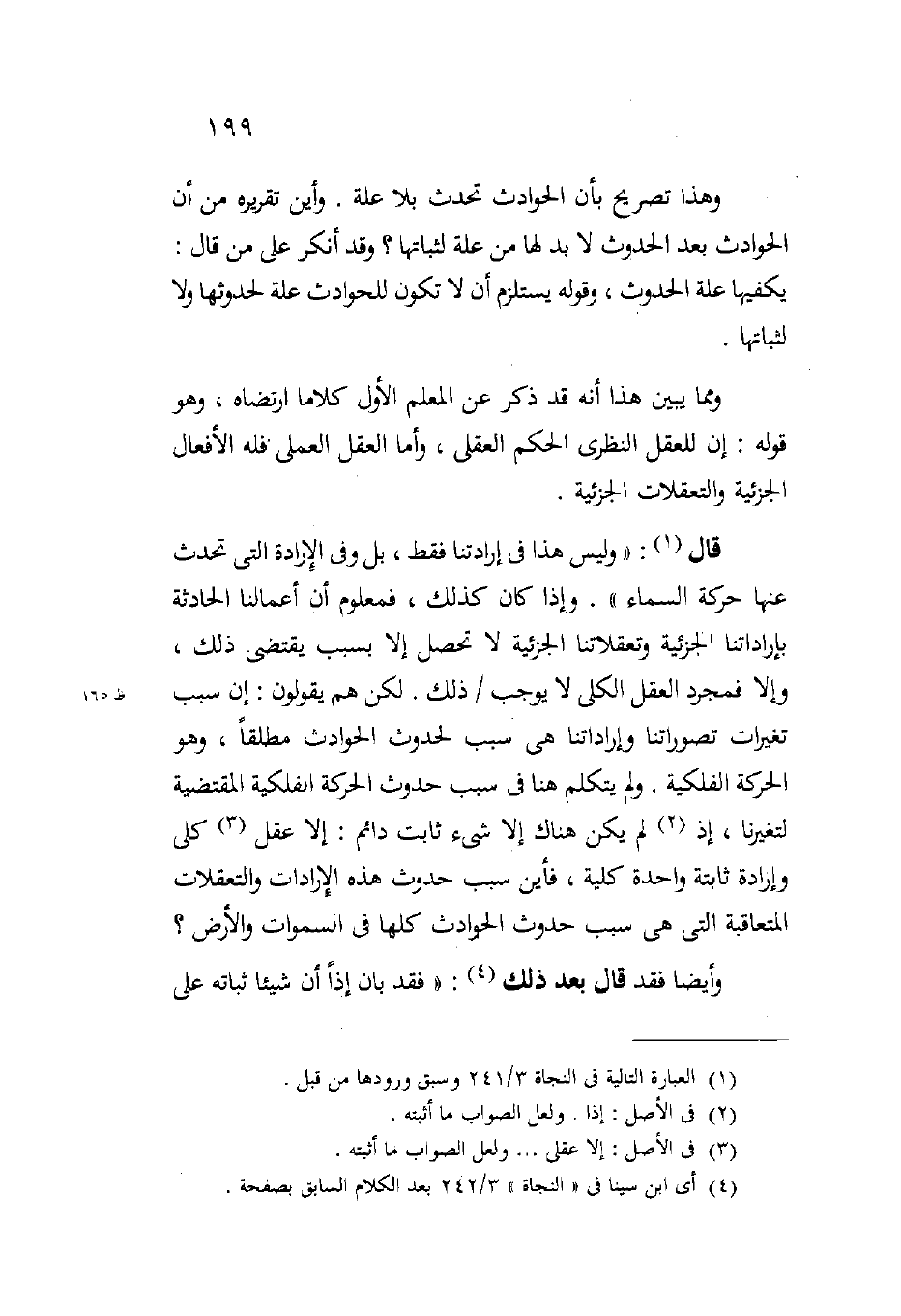 قال: "وليس هذا في إرادتنا فقط بل وفي الإرادة التي تحدث عنها حركة السماء" وإذا كان كذلك فمعلوم أن أعمالنا الحادثة بإراداتنا الجزئية وتعقلاتنا الجزئية لا تحصل إلا بسبب يقتضي ذلك وإلا فمجرد العقل الكلي لا يوجب ذلك لكن هم يقولون إن سبب تغيرات تصوراتنا وإراداتنا هي سبب لحدوث الحوادث مطلقا وهو الحركة الفلكية ولم يتكلم هنا في سبب حدوث الحركة الفلكية المقتضية لتغيرنا إذ لم يكن هناك إلا شيء ثابت دائم إلا عقل كلي وإرادة ثابتة واحدة كلية فأين سبب حدوث هذه الإرادات والتعقلات المتعاقبة التي هي سبب حدوث الحوادث كلها في السموات والأرض؟