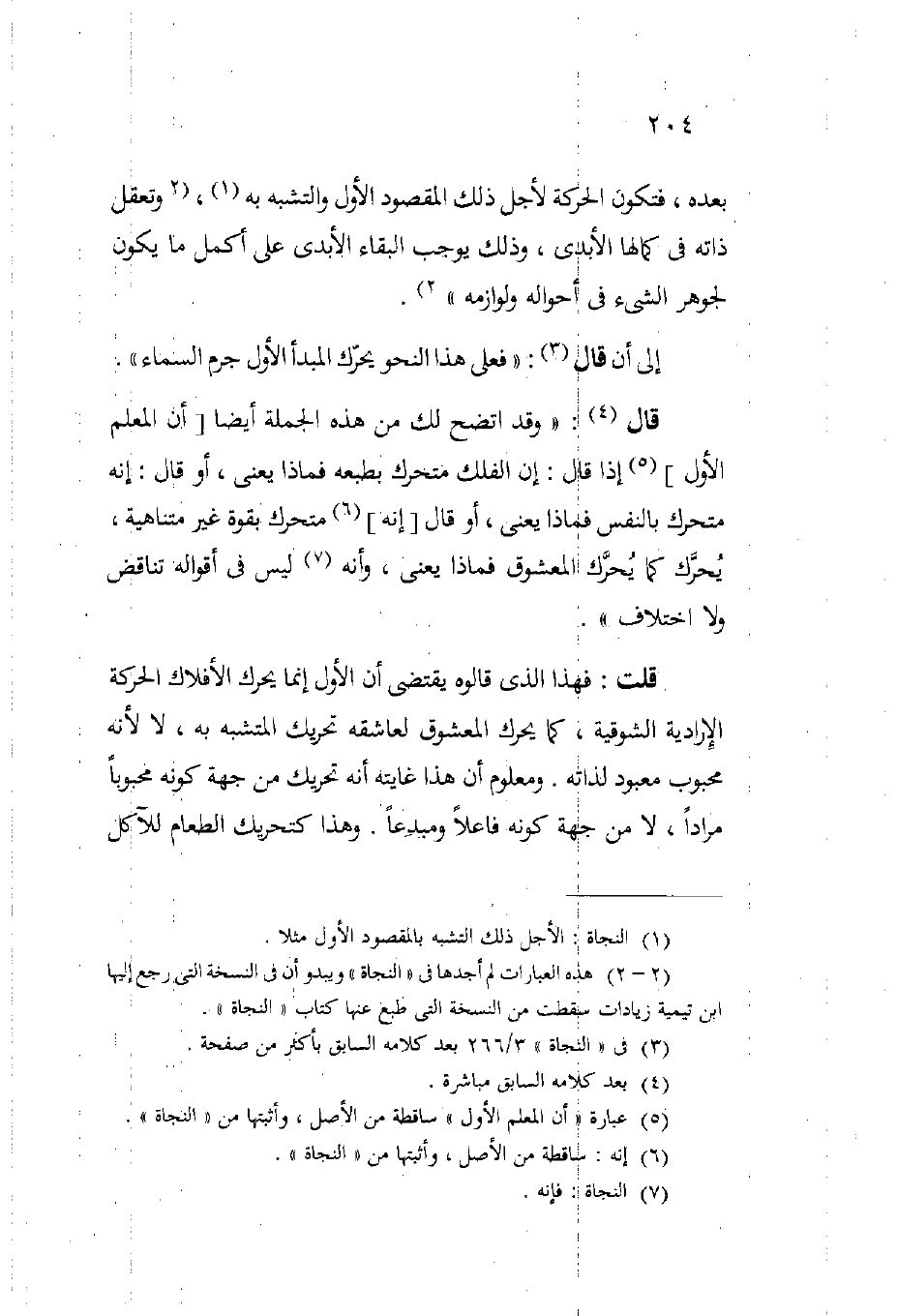 قال: "وقد اتضح لك من هذه الجملة أيضا أن المعلم الأول إذا قال إن الفلك متحرك بطبعه فماذا يعني أو قال إنه متحرك بالنفس فماذا يعني أو قال إنه متحرك بقوة غير متناهية يحرك كما يحرك المعشوق فماذا يعني وأنه ليس في أقواله تناقض ولا اختلاف".