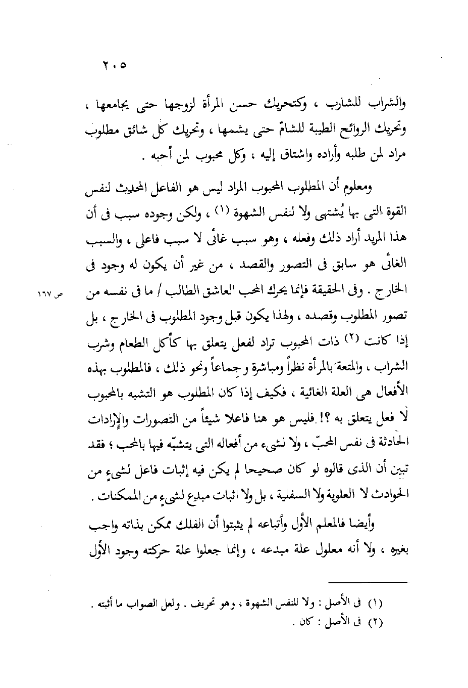 ومعلوم أن المطلوب المحبوب المراد ليس هو الفاعل المحدث لنفس القوة التي بها يشتهي ولا لنفس الشهوة ولكن وجوده سبب في أن هذا المريد أراد ذلك وفعله وهو سبب غائي لا سبب فاعلي والسبب الغائي هو سابق في التصور والقصد من غير أن يكون له وجود في الخارج وفي الحقيقة فإنما يحرك المحب العاشق الطالب ما في نفسه من تصور المطلوب وقصده ولهذا يكون قبل وجود المطلوب في الخارج بل إذا كانت ذات المحبوب تراد لفعل يتعلق بها كأكل الطعام وشرب الشراب والمتعة بالمرأة نظرا ومباشرة وجماعا ونحو ذلك فالمطلوب بهذه الأفعال هي العلة الغائية فكيف إذا كان المطلوب هو التشبه بالمحبوب لا فعل يتعلق به فليس هو هنا فاعلا شيئا من التصورات والإرادات الحادثة في نفس المحب ولا لشي من أفعاله التي يتشبه فيها بالمحب فقد تبين أن الذي قالوه لو كان صحيحا لم يكن فيه إثبات فاعل لشيء من الحوادث لا العلوية ولا السفلية بل ولا إثبات مبدع لشيء من الممكنات.